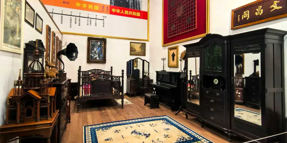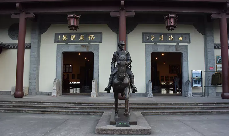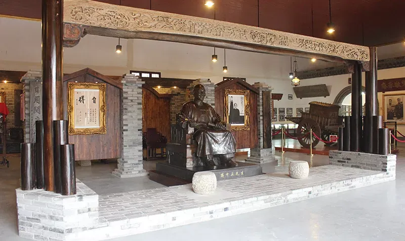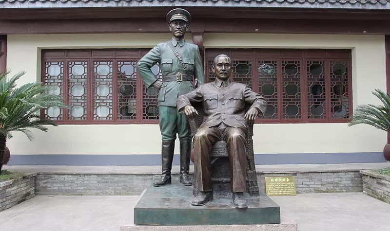 豐鎬房即蔣氏故居,是溪口鎮上重要的人文景觀。從前,按照當地的習慣,每個家庭都有房名,蔣氏在宗譜中屬“周”字輩,由此推及西周兩代皇帝建都的豐邑、鎬京作為自家的房號,希望自己的家族也能象西周一樣興旺發達,豐鎬房的名字就這樣定了下來。豐鎬房又名素居,是因蔣家世代信佛,吃素唸經,故而得名。豐鎬房佔地4800平方米,建築面積1850平方米。建築格局為前廳後堂、兩廂四廊,是傳統的世家府第格局。前廳及左右還有三個花園,有月洞門相通。中間小天井,兩邊有金銀桂花各一株,是宋美齡親手所種。東廂房留給宋美齡居住,但一直都空着。西廂房為毛福梅的住所。西廂房西側有幢獨立小樓,原系祖傳的三間房屋,這裡是蔣母王采玉舊居。為尊重祖宗,保留風水,豐鎬房擴建時所有新宅屋基,高度不能超出這幢祖居的屋基。豐鎬房裡還有三大看點,即雕刻、彩畫和堆塑。進入前廳,抬頭可見屋頂正中的堆塑,兩邊是“雙龍戲珠”。祭祖敬天的報本堂,是豐鎬房整個建築的核心。走廊兩端壁上有兩幅彩畫,東首是“八仙過海”,西首是“姜太公釣魚”。柱頭兩側的“牛腿”上是木雕,是《三國演義》中的故事,從東到西分別是“劉備招親”、“夜戰馬超”、“關羽戰長沙”和“回荊州”。東西廂房四個柱頭上的木雕也取材於《三國演義》,即“送皇嫂”、“古城會”、“上馬獻金”、“斬顏良”。東廂房走廊上的木雕,內容是《精忠岳傳》,有“湯陰大水”、“拜師周侗”、“操場比武”、“岳母刺字”。東廂房走廊上的雕刻是上八洞神仙的羣像,有鐵枴李、呂洞賓、韓湘子、何仙姑。還有“聞太師回朝”、“陳琳抱盒”、“岳飛收花槍”等彩畫。