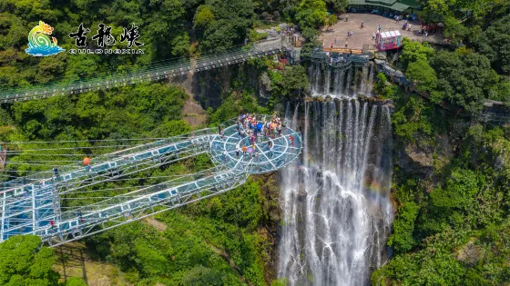 古龍峽雲天玻霸,是一個集懸空玻璃平台、玻璃懸廊、玻璃棧道、玻璃吊橋、玻璃天鏡、玻璃直播間6位一體的玻璃觀光組合。景區使用3層6.0厘米厚度的超白夾膠玻璃,透光率99.15%,具有清晰的亮度、超高的光折射率。6大玻璃項目懸浮在古龍峽高度530米的群山之巔、瀑布之上,從懸崖絕壁凌空而出,全長1300米,面積1.2萬平米,氣勢磅礴而又和諧統一。高差達千米的古龍大峽谷集瀑布、深潭、奇石、叢林於一體,其中的萬丈崖大瀑布,單體落差達131米。雲天玻霸包攬12項世界紀錄,問鼎世界高空遊覽新霸主。