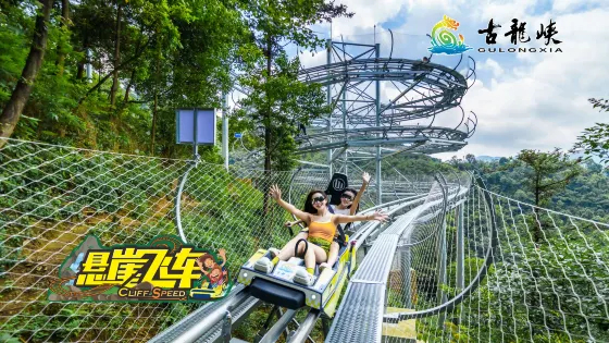 峽道飛車全長3680米,猶如一條天路盤旋在巍峨的古龍山脈之上,跨越3座山峰,依山取勢,蜿蜒起伏,一彎接一彎,全程落差高達260米,時速可達30km。賽道設計融合了多種複合型彎道,包括多個直角彎、髮夾彎、360度螺旋彎、8字迴旋彎等28個極具挑戰性的彎道。其中「9連髮夾彎」超越了以「5連髮夾彎」聞名世界的秋名山賽道,是目前國內長、彎道多的山道滑車項目,九曲二十八彎,實至名歸。