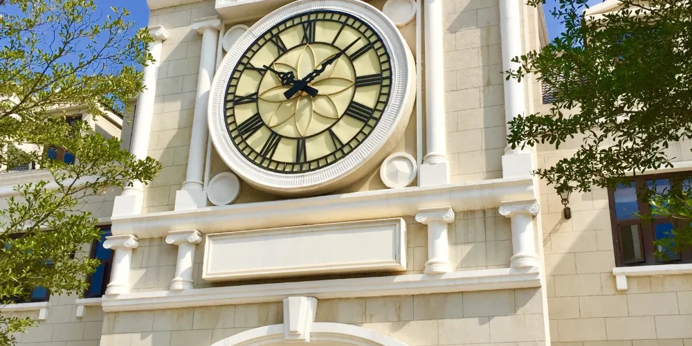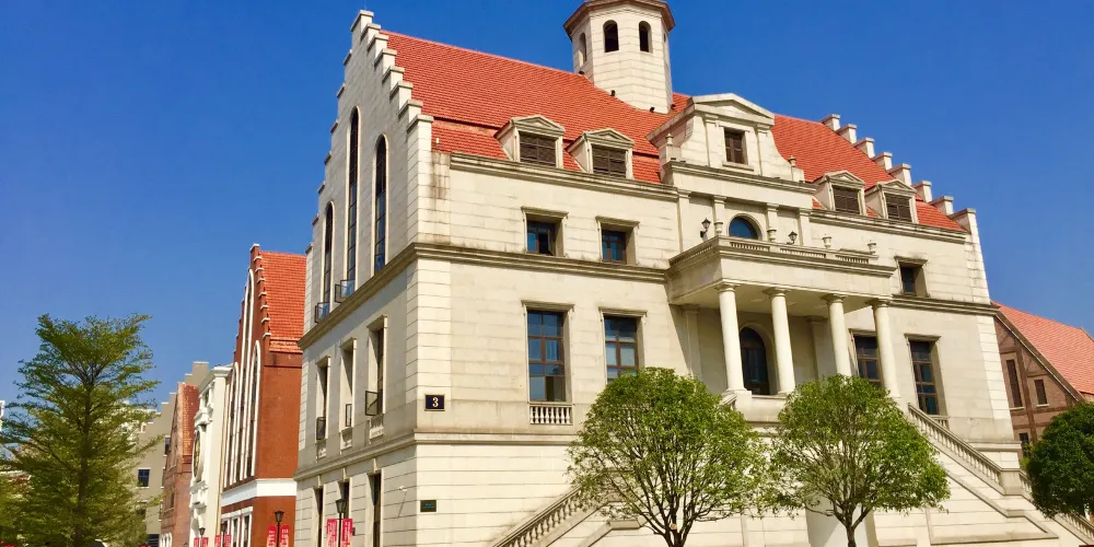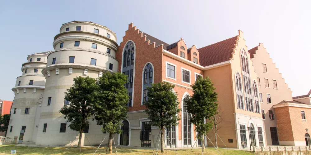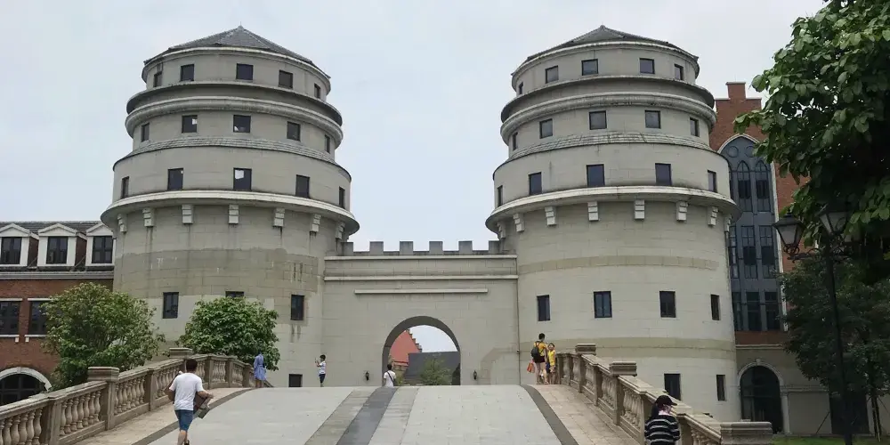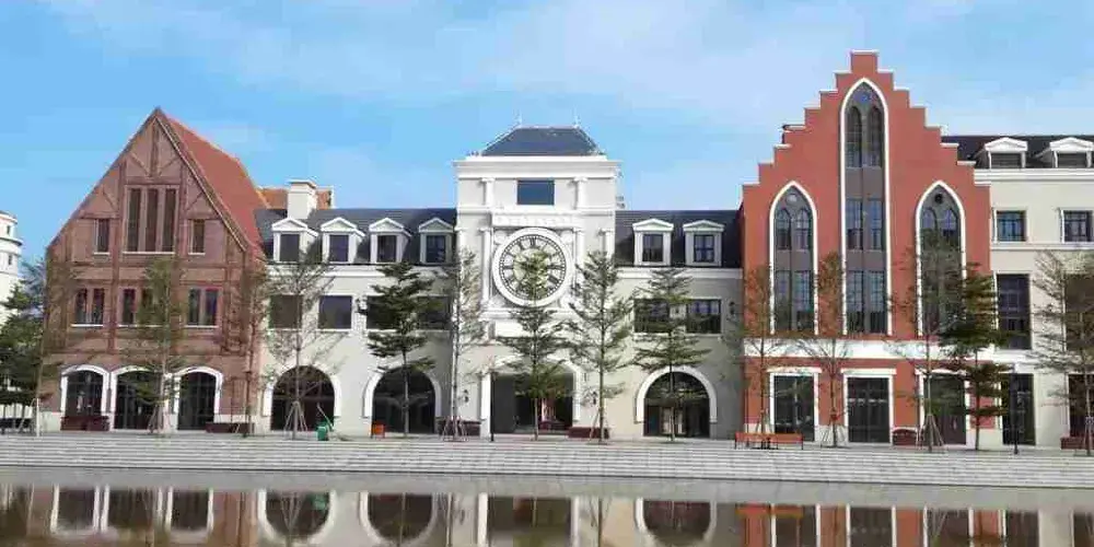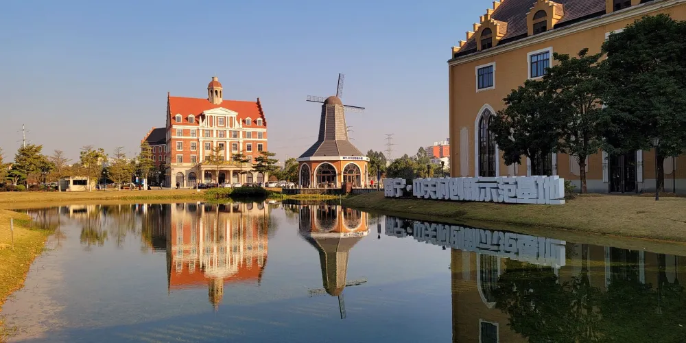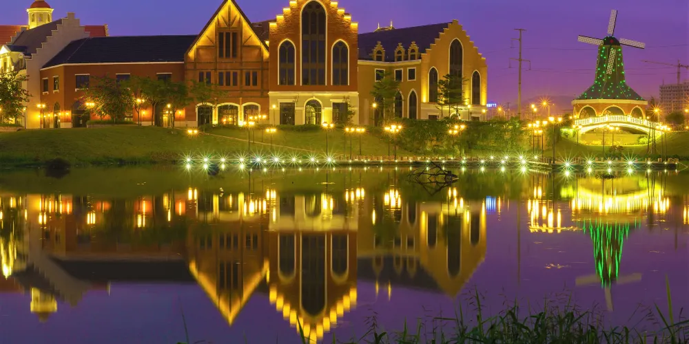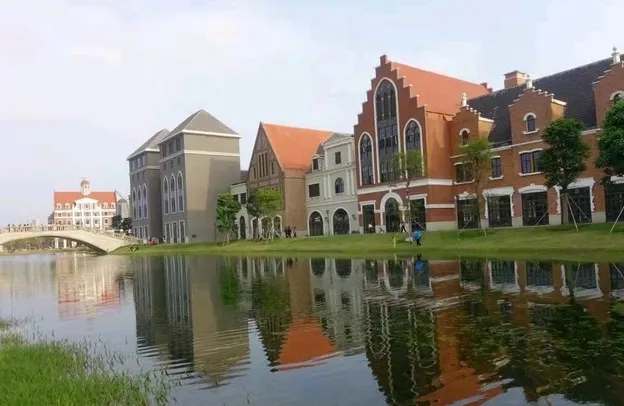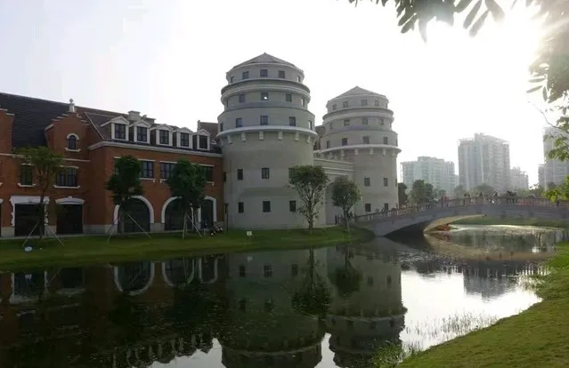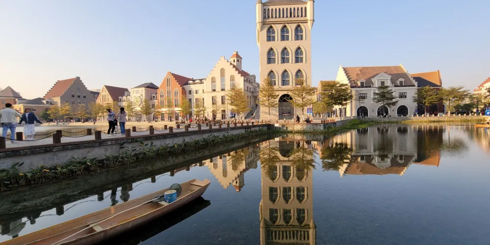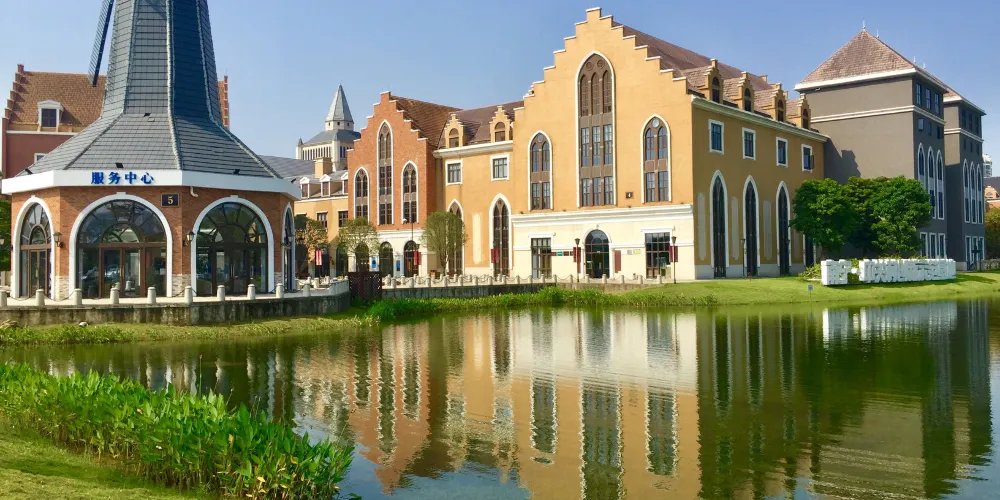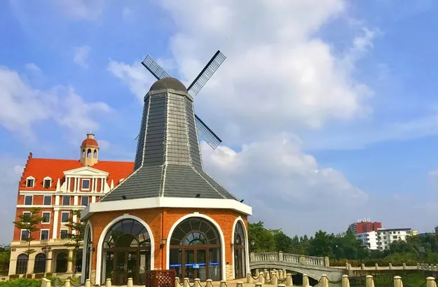 小鎮仿造歐洲的小鎮格局建成,有風車、下沉廣場、市政廳、燈塔等極具特色的建築羣。走進園區,首先映入眼簾的是一排城堡式的建築,穿過橫跨環城水系的廊橋,被一片白牆紅瓦的建築包圍,令人感覺彷彿真的置身歐洲的某個小鎮中。