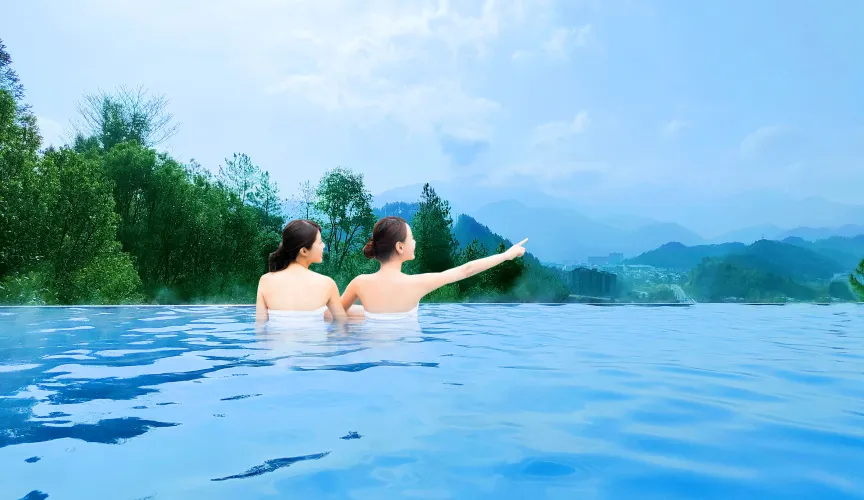 明月山維景國際溫泉是集溫泉療養、休閒娛樂和旅遊度假為一體的綜合養生溫泉中心。溫泉中心依山而建,池子隱藏在竹林之中,山間的步道台階清幽隱蔽,可以一邊泡溫泉,一邊享受清新的自然空氣,是修身養性、放鬆心情的度假之地。