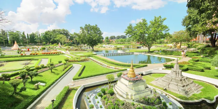 迷你暹羅是世界第四大微型景觀。園中展示了泰國眾多有名的文化和歷史建築物,還展出了泰國的地形和自然環境,包括高山、河流及名勝古蹟等。園中還有一些其他國家的建築物,如埃菲爾鐵塔、比薩斜塔、羅馬鬥獸場、自由女神像等。