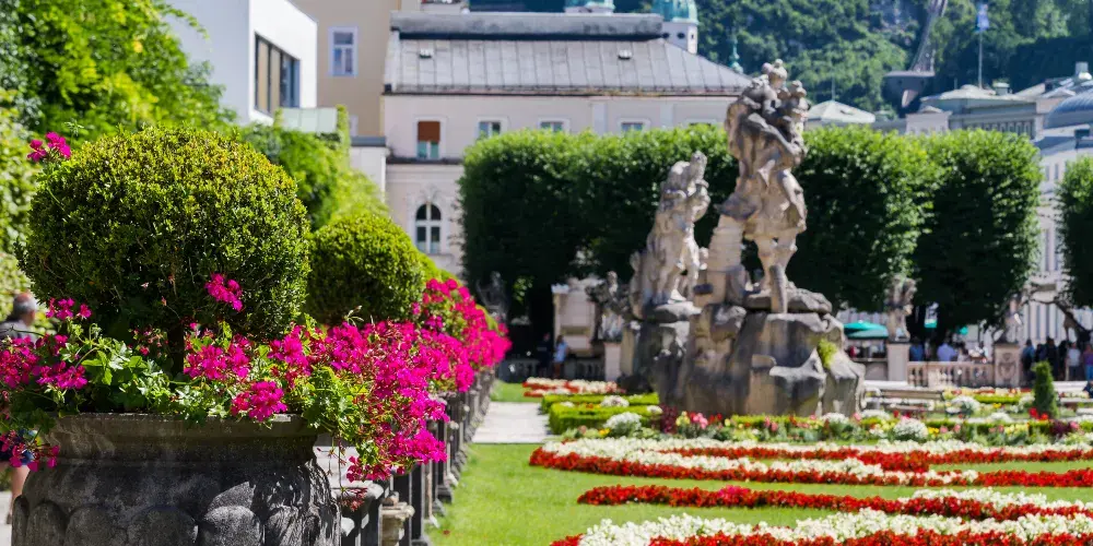 米拉貝爾花園是一座充滿巴洛克風情的夢幻花園,也是歐洲較為精美的宮殿花園之一,園內有超過10萬株盛開的鮮花,植物的多樣性以及開闊、生機勃勃、陰涼靜謐的氛圍,不斷吸引著當地居民和來自世界各地的遊客。米拉貝爾花園擁有令人印象深刻的視野、景緻以及色彩與形態的交相輝映,還擁有眾多藝術水準很高的雕像、噴泉和人物雕塑,並於2007年被聯邦古蹟局列為歷史古蹟。春回大地,溫暖的天氣一過,成千上萬的三色堇、貝母和勿忘我便點綴著花園,番紅花隨處綻放,鬱金香的花莖也破土而出。花園中央的大型噴泉十分壯觀,四周環繞著希臘神話中的人物雕像,如像徵四大元素的雕像等,每一座雕像都栩栩如生,彷彿在訴說著古老的神話故事。