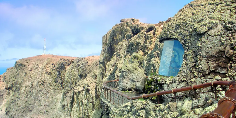這是一個位於加那利群島蘭薩羅特的觀景台。觀景台由兩個層次組成:第一層是一個室內觀景區,有窗戶,提供令人驚嘆的風景全景。第二層是戶外露台,可以看到更廣闊的景色。