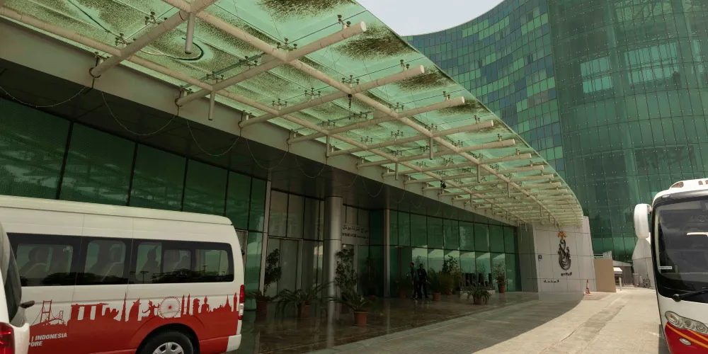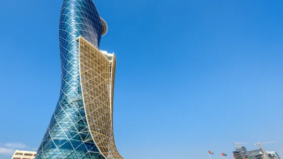 謝赫紮耶德大橋被稱為“史上結構最複雜的橋樑”,有著優美的弧形拱狀造型,宛如起伏的沙丘。該橋長842米,高64米,由普利茲克建築獎得主紮哈·哈迪德設計。白天可以欣賞橋面從對稱的鋼鐵拱架上“落空”而現,宛若波浪般的流動剪影。到了夜晚,則有淡雅的霓虹燈光映照著橋樑的輪廓,異常漂亮。