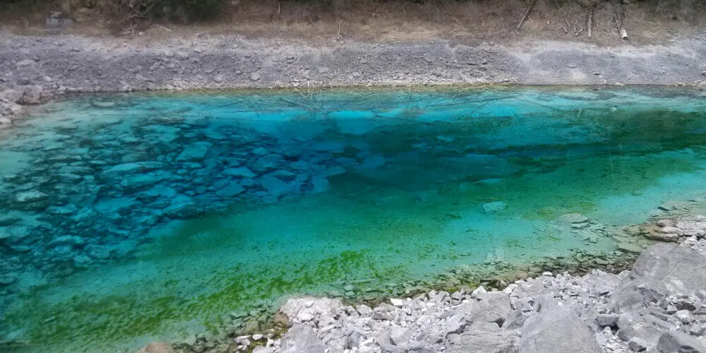 上游珍珠灘瀑布的激流,在凹凸不平的乳黃色鈣化灘面上濺起無數水珠,陽光下,點點水珠就像巨型扇貝里的粒粒珍珠,遠看河中流動着一河潔白的珍珠。這就是珍珠灘。珍珠灘上密佈的淺黃色苔蘚很是奇特,它們並不滑膩,赤腳踩在上面就像踩在海綿上一樣。幾年前,遊人還可涉灘戲水,親自體驗珍珠灘的神奇,現在衹能在岸邊觀看,不能下水,遊客可通過棧橋穿過石灘。
