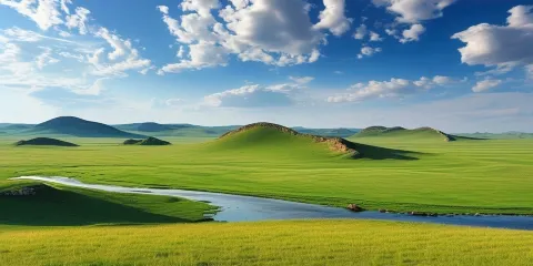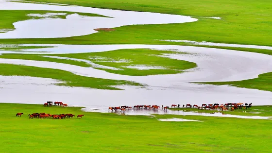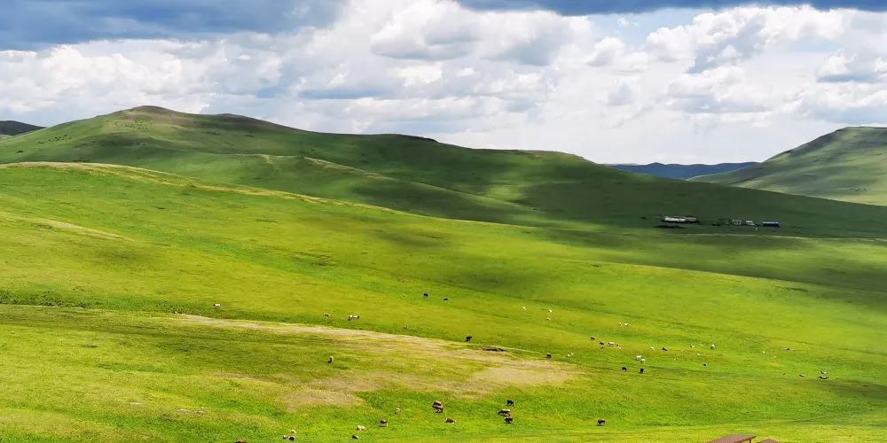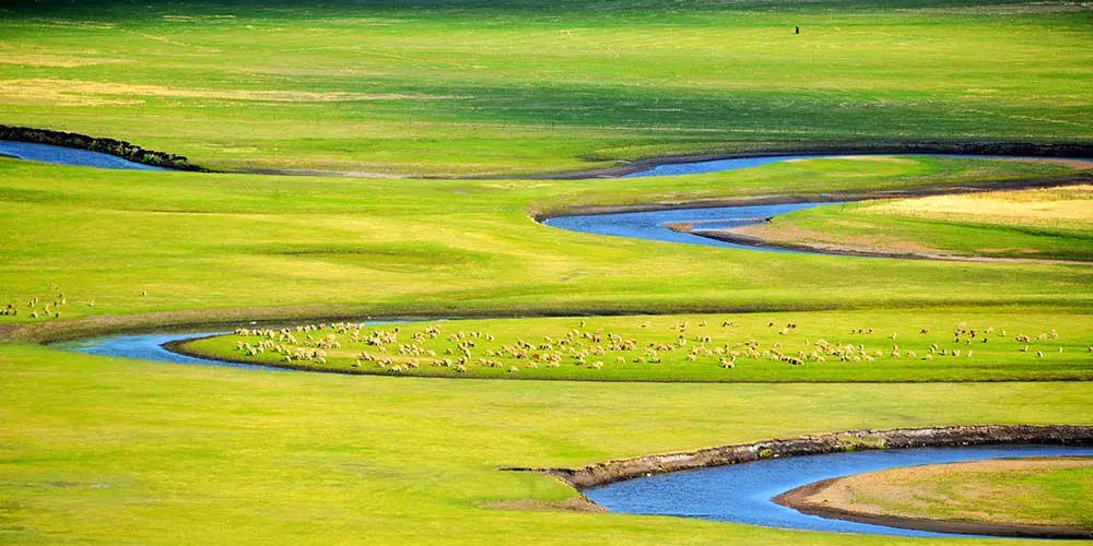 每逢水草豐茂的夏季,點點蒙古包與成群的牛羊散落河畔,為一望無際的翠綠草原增添生機,勾勒出一幅詩意盎然的遠方美景。