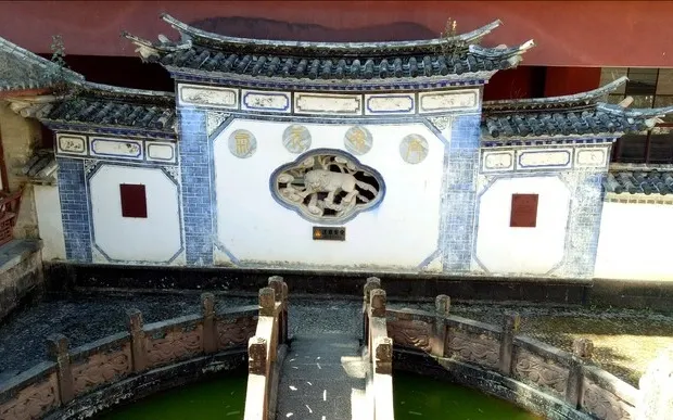 水池的中央有兩個各重達16噸的大理石球,代表了太陽和月亮,每逢甲子年,由於太陽、月亮、地球的公轉和自轉到同一條線上,這時候在墨江就會出現太陽還沒有落山,月亮便開始升起,在日光和月光的照射下,這兩個大理石球便會產生兩個不同方向的投影並且交織在一起,因此形成了「日月交輝」的景觀。
