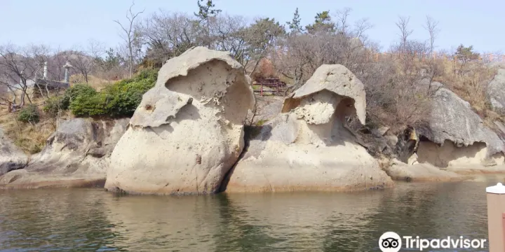 天然紀念物“斗笠巖”是海邊的一對巖石,他們經過1億年以上的風波和侵蝕而變成了兩個帶着斗笠的人的形狀。斗笠巖有一個“生病的父親和兒子”的悲傷傳説,在2008年以前衹能在乘船的時候看見它的樣子,現在可以在“斗笠巖海上步行橋”邊走邊欣賞。