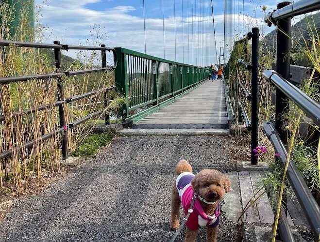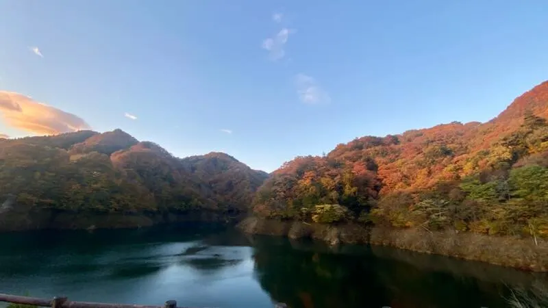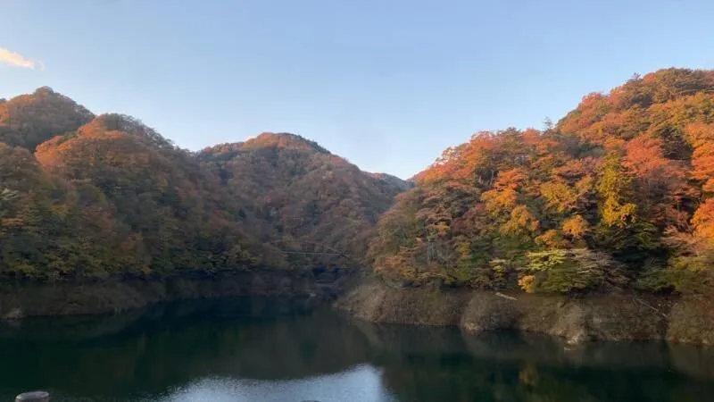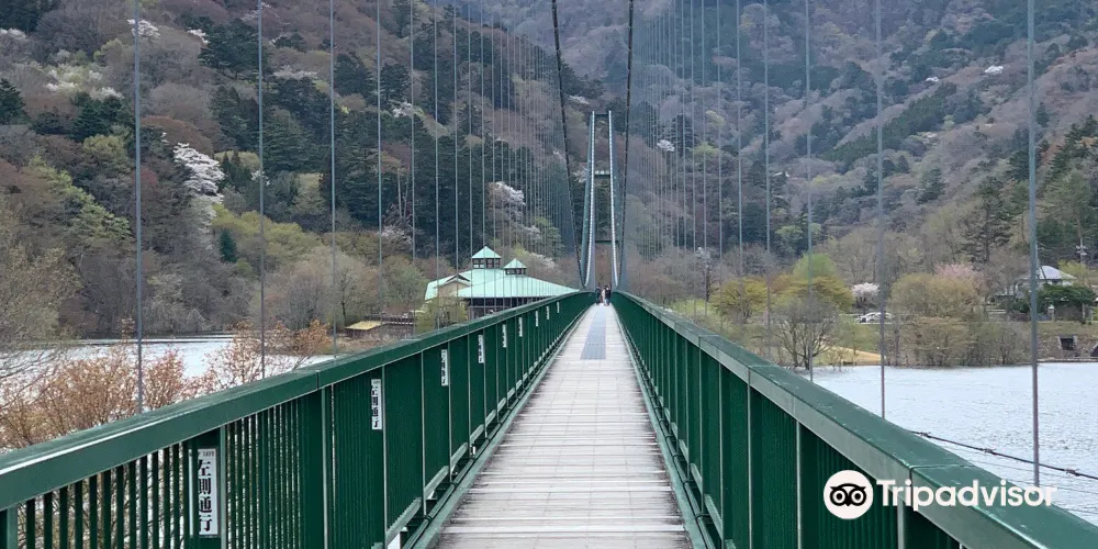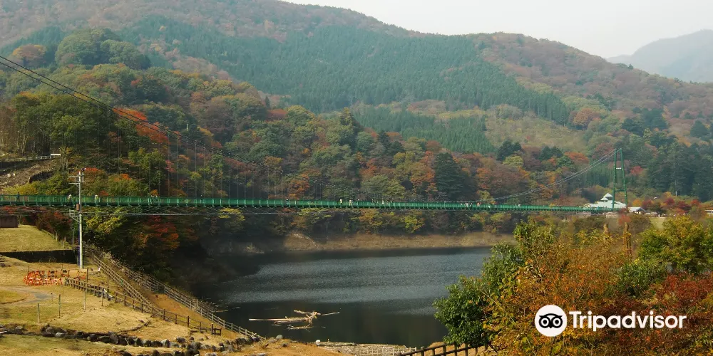 吊橋是依靠繩索拉起來的,沒有橋墩,踩上去搖搖晃晃,很有感覺。周邊有山,湖,大壩,深秋時節還有紅葉,景色十分優美。