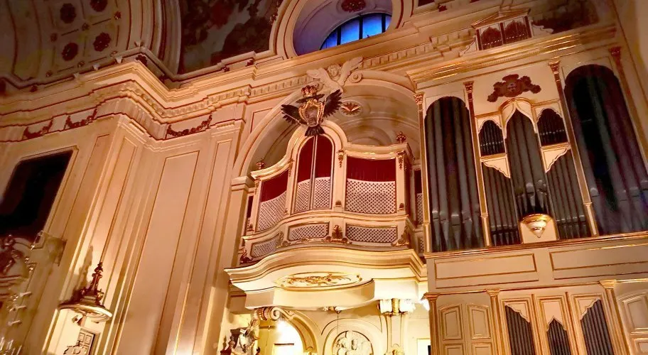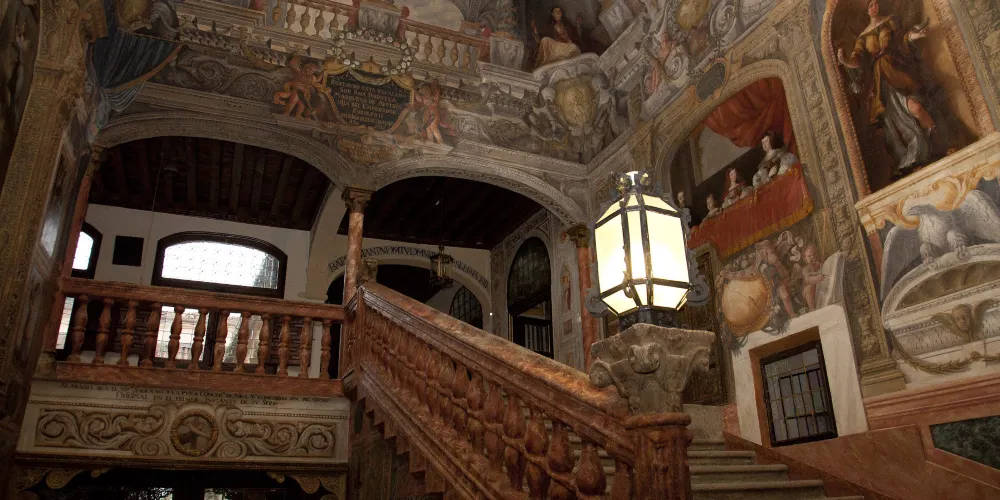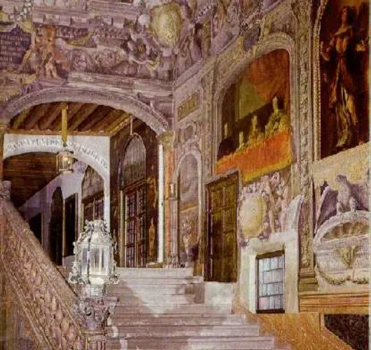 △ 裝飾著金飾、皇家紅色天鵝絨地板和牆壁、與房間本身一樣宏偉的枝形吊燈,並欣賞提埃坡羅 (Tiepolo) 繪製的天花板。 驚嘆於薩巴蒂尼設計的主樓梯,共有 70 多個台階。