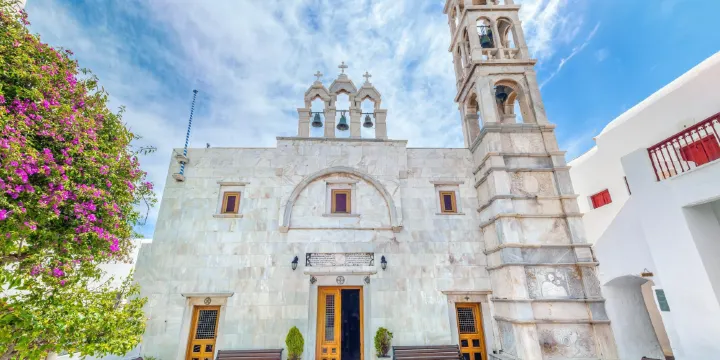 圖爾利亞尼斯修道院位於米科諾斯島內陸的居住區上邁拉(AnoMera),距米科諾斯鎮以東8公里處。教堂的白色外牆和精緻穹頂十分醒目,精美的大理石制的多級鐘塔很值得一看,上面有精美的雕刻圖案,還有16世紀克里特學院成員的繪畫。教堂內完好地保存有18世紀晚期在佛羅倫薩雕刻的木質聖壁及壁畫。