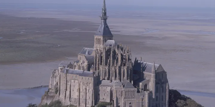 △修道院教堂建於1023年,整個工程花了近一百年才完成。修道院是海灣中心的戰略要地,也是中世紀諾曼第公國的堡壘。在百年戰爭期間,儘管該地區發生了無數衝突,聖米歇爾山仍然進行了抵抗。這尤其要歸功於強大的城牆的建造,這使得它成為一座堅不可摧的城市,但無疑也歸功於潮汐的不斷來來去去。
