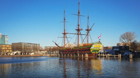 新的“阿姆斯特丹”號是當年一艘東印度舵手的仿造品,原船於1749年在英格蘭海岸線附近遭受侵擾而沉沒。複製品現停放於荷蘭航海博物館特殊的碼頭內,在真甲板上可見到打撈起來的原船殘骸。在國王節等當地重大節慶人,荷蘭王儲也會登船啟航。