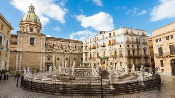 普雷託利亞廣場位於義大利西西里島的巴勒莫市中心,是充滿歷史和藝術魅力的景點。廣場以其中央的普雷托利亞噴泉而聞名,這座噴泉由雕塑家弗朗切斯科·卡米利亞尼於16世紀設計,展示了多尊精美的大理石雕像,包括神話人物和動物,細節栩栩如生。廣場周圍環繞著幾座重要的建築,如巴勒莫市政廳和聖卡達多教堂,遊客可以感受到強烈的歷史氛圍。