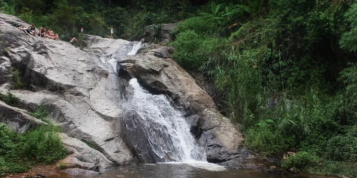 瀑布距離拜縣區10公里左右,是距離鎮上較近的瀑布。瀑布規模較小,是由三個不同大小的瀑布組成的小瀑布羣,很美麗,很多喜歡叢林探險的遊客都前來玩耍。有兩個可以游泳的水潭,遊客還可以穿上游泳衣到清涼的水中游泳,嬉水。瀑布外有一些本地人經營的小吃攤,可以玩耍過後到外面嚐嚐小食。