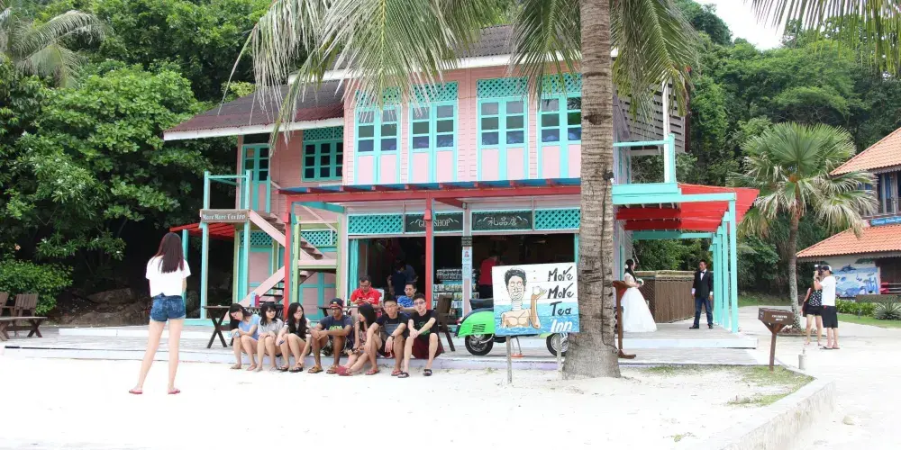 因為一部電影而成名的景點,熱浪島不是一個,但卻是最浪漫、最美麗的一個。電影《夏日嬤嬤茶》使熱浪島名聲大噪,因電影拍攝建起的五彩小木屋,後來成為熱浪島上最熱門的景點和留影點之一。現在小木屋雖然已經拆除,但在原址建造的一座紅綠相間的房子仍然命名為“嬤嬤茶屋”,並且吸引著眾多遊客。現在這座房子一層是商店,二層是酒吧。至今小屋門前還保留著英文More More Tea Inn的藍色招牌。小屋的側面有一個用花朵凹出來的心型花環,非常適合情侶們在這裡合影留念。另外,小屋不遠處還有三個人形立牌,分別是當年電影中的三個男主角,赤膊著上身,穿著花褲衩,手裡彈著吉他,再現了電影中的畫面,讓人們重溫那段浪漫唯美的愛情故事。如今小屋的一層是一個旅行紀念品店,可以買到各種冰箱貼、頭飾及海龜造型玩偶等。另外,這裡出售的冰激淩好吃而且不貴。到了晚上這裡又是另外一番燈紅酒綠的景象,很多遊客都會跑到小屋來,坐在露天的位置上,點上一杯啤酒,吹吹海風,聽聽輕快的音樂,感受浪漫的夏日氛圍。此外,如果時間充裕的話,還可以選擇在小屋前的海域浮潛,暢享熱帶風情。