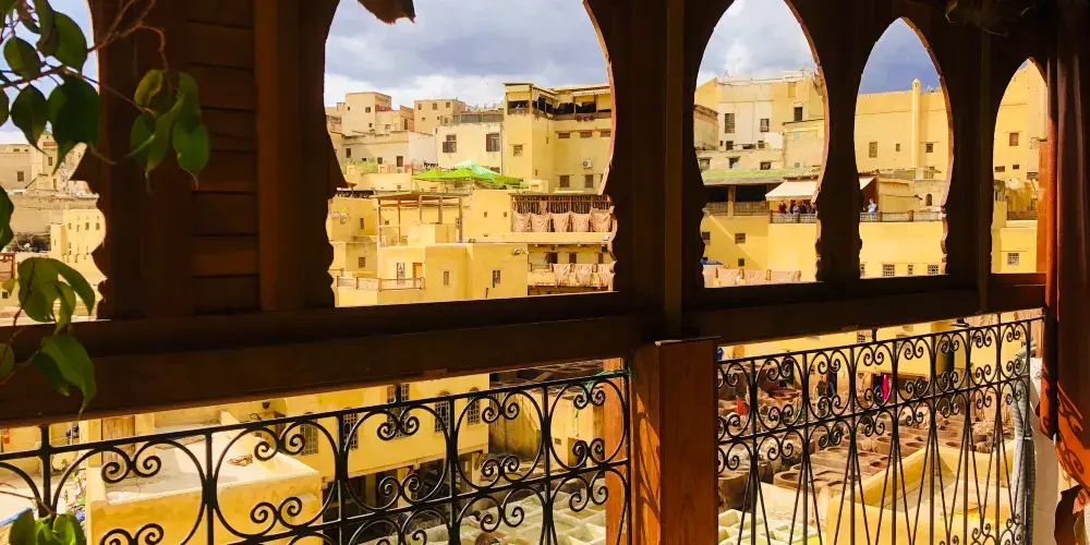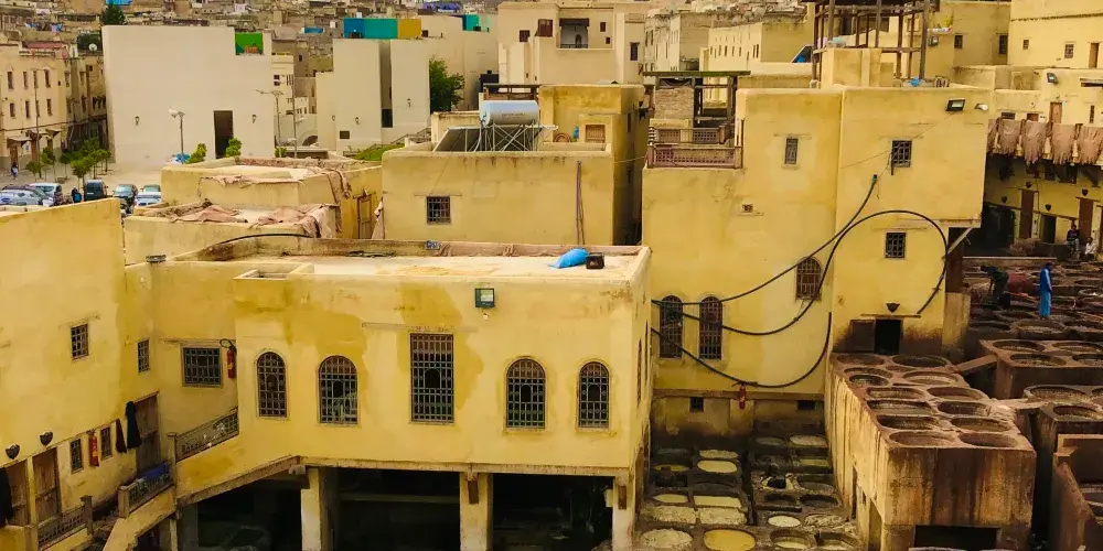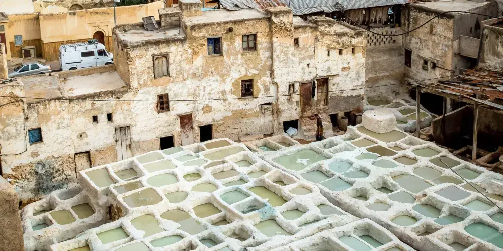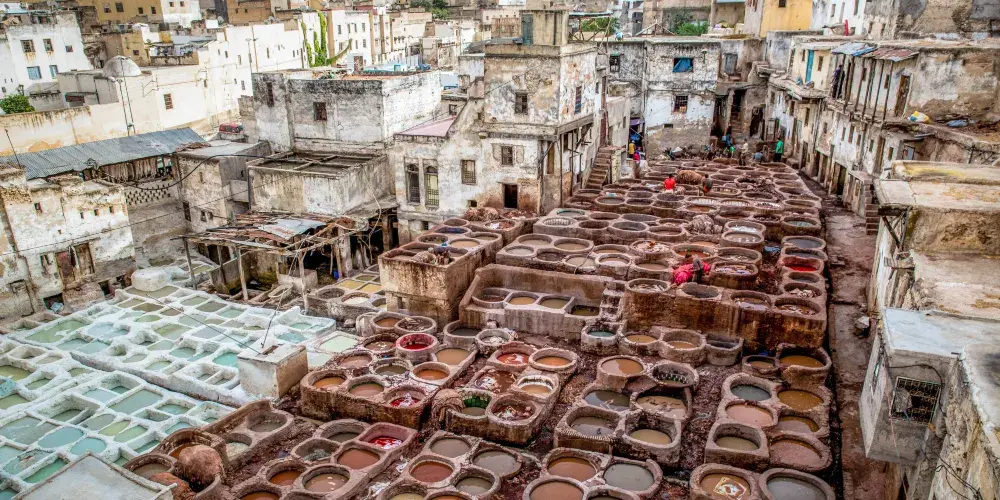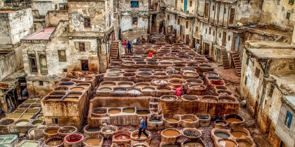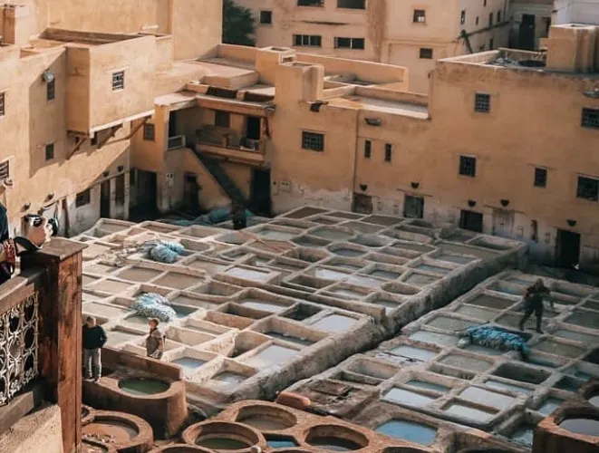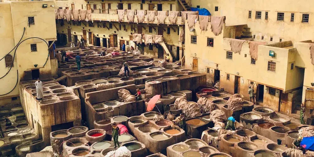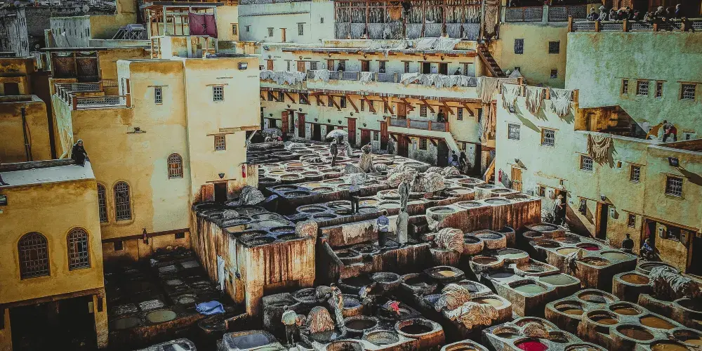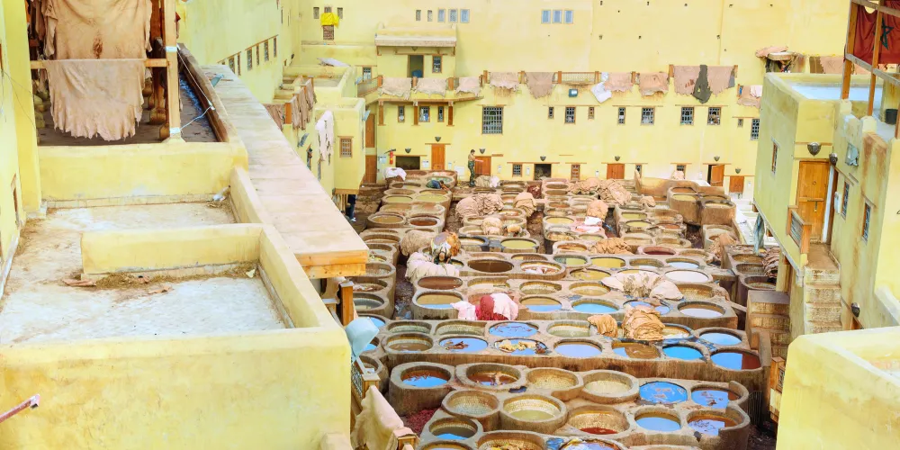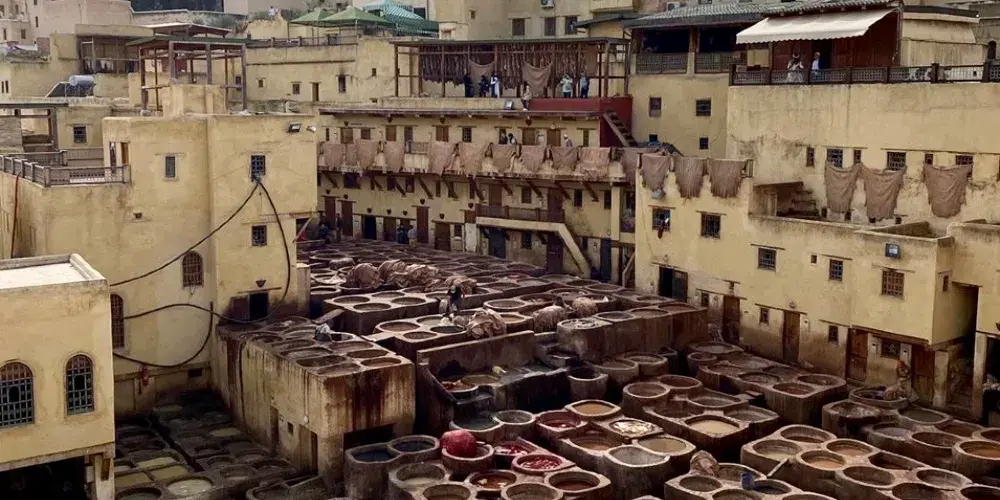 非斯古城裡頗具“色彩”的景點就是皮革染坊。在迂迴曲折的小巷迷宮中,遠遠的就能聞到一股刺鼻的味道,據說非斯是世界上極少仍保持傳統皮具染色方法的地區之一,當地人用驢子送來皮革,再將它們放入一格格染槽中,保留著傳統搓揉及風乾的古老方法,讓天然植物的顏色在皮革上美麗地呈現出來。這裡的皮革製品在北非之所以享有盛譽,得益於每道工序依舊嚴格地按照這種傳統工藝進行著。