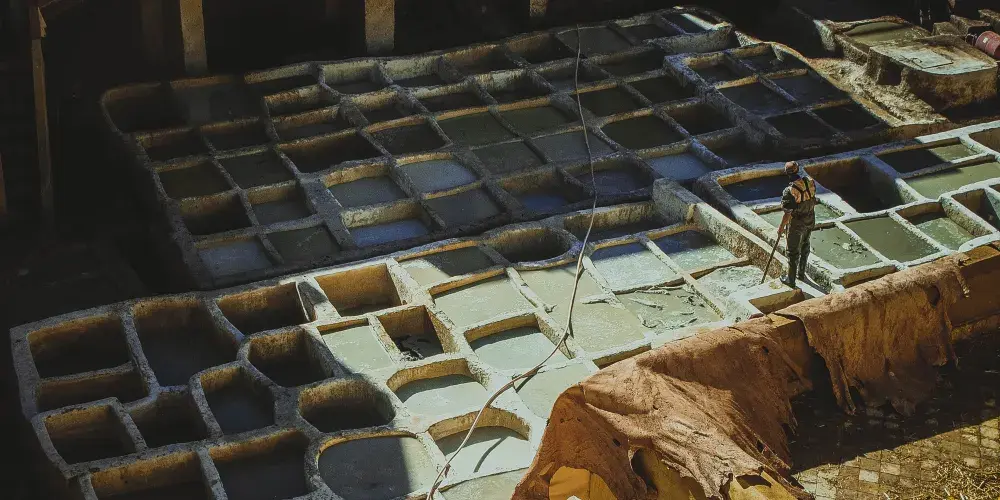 參觀皮革染坊前每人都會給一支薄荷葉,要將薄荷葉放在鼻子處,才不會被刺鼻的氣味嗆到。染槽都在樓頂上,遊客可以在房屋高處俯瞰了整個染坊,之後被帶到皮具陳列處,每一層都是不同的產品,顏色都比較鮮豔,款式基本上是當地的風格。