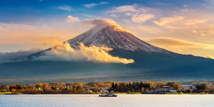 富士山屹立於本州中南部,跨靜岡、山梨兩縣,可以搭乘特急列車往返東京。這座被日本人奉為“聖岳”的山峰自有文字記載以來,曾多次噴發,较近的一次噴發是在1707年,此後休眠至今。如今,山頂積雪的富士山已經成為日本重要的象徵之一。
