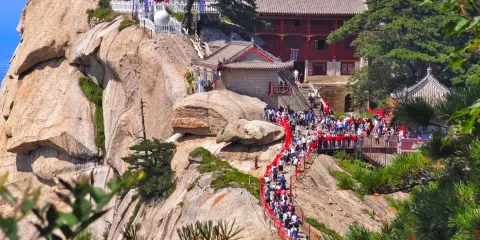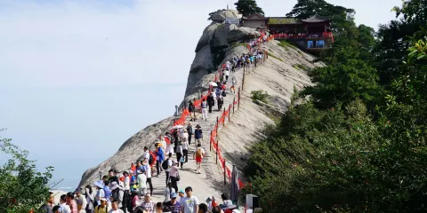 華山北峯索道設於華岳主峯-北峯之地,北峯是登臨其它四峯的要沖,山勢險峻,也是觀景攬勝的好去處,登高至此,再乘坐北峯索道順勢而下,衹見三面絕壁,是恐高症慎入的驚險索道。
