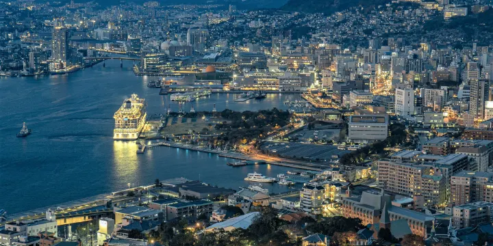 稻佐山位於長崎市西北,在此可眺望長崎夜景。長崎的夜景與神戶、函館夜景並稱日本三大夜景。山頂上的圓形瞭望台上,可以把被稱作“鶴之港”的美麗的長崎港一覽無餘。在晴朗的日子,還可以遠望至雲仙、天草、五島列島的全景。夜幕降臨時,璀璨的萬家燈火,從高處望去,猶如打翻了的百寶箱,灑了一地的金銀珠寶,它有著“1000萬美元夜景”的美譽,確實亮麗得令人驚嘆。