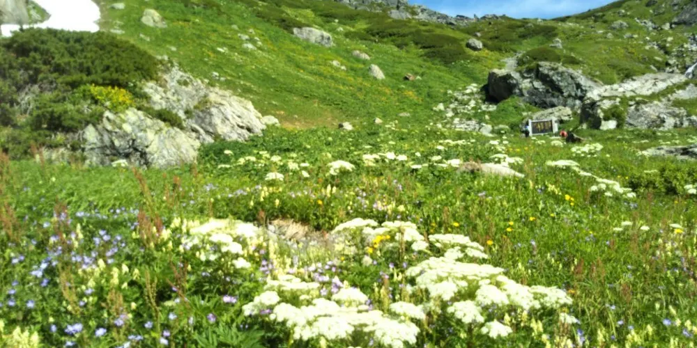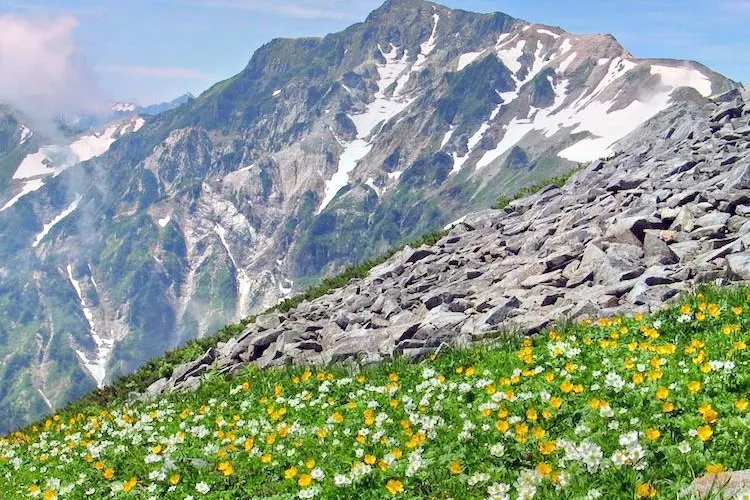 日本百名山之一的白馬岳是有名的登山地,深受户外登山愛好者喜愛。一是擁有日本很大的雪溪,冬季吸引着眾多滑雪愛好者來此一嘗從山頂速降的樂趣,夏天更是有大量的登山愛好者來到這裏,腳下是延綿的雪溪,而兩旁是片花田,這種奇妙的季節錯位感是唯有在白馬岳能體會到的。白馬岳的另一是位於山頂的白馬山莊,能同時容納1500名的宿泊客,與普通山小屋通常衹能容納一兩百人相比,可見其規模,也可以想象白馬登山是何等的人氣。