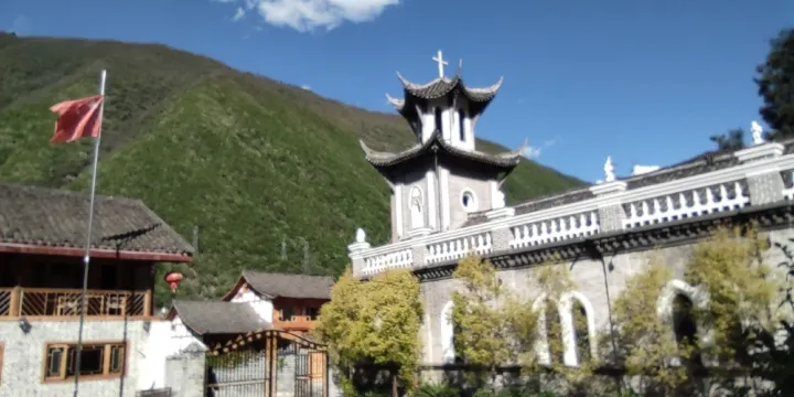 屹立在磨西古鎮的磨西平台上的磨西天主教堂,是一座歐式風格的標誌性建築。象徵著天主教派在磨西有過一段輝煌的歷史。1892年左右,法籍傳教士彭某在丹巴傳教遇害,獲賠白銀2000兩,其弟弟用這筆賠銀在磨西置地,為建磨西教堂作準備。彭弟初來磨西租一湯姓的民院設教堂傳教,發展教徒。1918年彭主持修建磨西天主教堂,1922年完成神甫座房,1926年鐘樓、經堂落成。到1950年解放初時,天主教堂置地二、三百畝,年收租2000多石(1石為100市斤)產業累計21萬元,磨西教區有教徒四、五百人。那些來自遙遠國度的傳教士着華服、説漢話,改漢姓,食農飯,百折不撓,苦心辦起修道院,拉丁學堂,麻風病醫院。給偏僻的磨西帶來了福音。1935年5月29日晚10時許,連續行軍同志宿營磨西天主教堂神甫房。磨西會議為5月30日的瀘定橋會議奠定了基礎,起到了預備會議的作用。1950年3月磨西解放,外籍傳教士遣返回國,教堂財產收歸政府,土地回到農民手中,天主教活動一度停止。1988年1月,成立了“瀘定縣天主教愛國會”,由政府撥款修復磨西天主教堂和神甫樓,作為磨西天主教徒集中活動的定點場所。