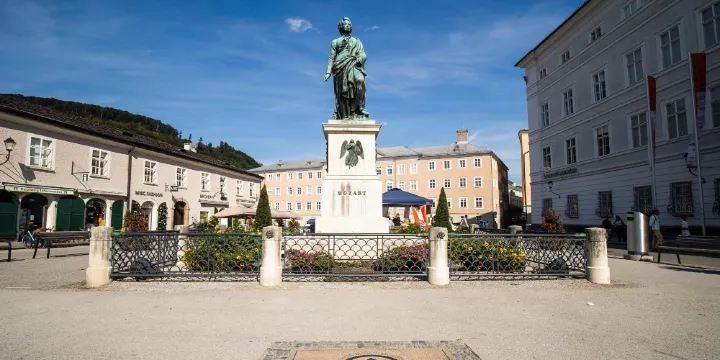 莫紮特廣場位於主教廣場東北側,廣場上的莫紮特塑像由薩爾茨堡人捐款於1842年9月5日落成,莫紮特的兩個兒子出席了落成典禮。1997年薩爾茨堡老城被列入世界文化遺產名錄時,塑像前面的地面上的刻字記錄了這一曆史時刻。莫紮特廣場1號是薩爾茨堡博物館。