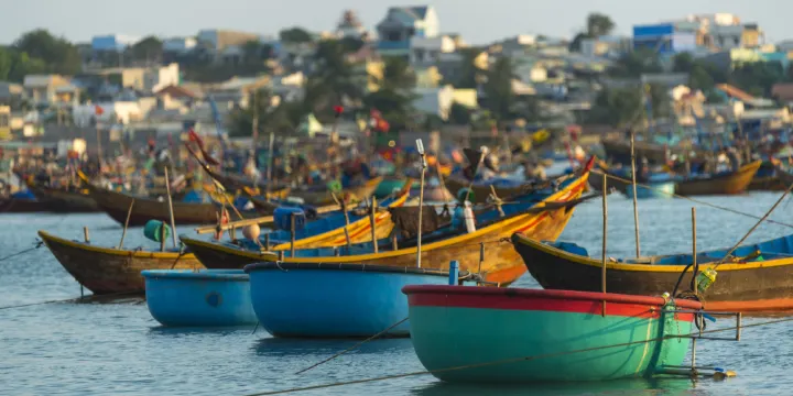 美奈漁村位於美奈東部。漁村至今還保持著原始的模樣,樸素自然,既是漁港,也是海灘。沿著漁村的台階下到海邊,岸邊停著大小不同、顏色各異的漁船,遠看就像玩具一般。在這裡,遊客可以欣賞美麗的日落,品嚐美味的海鮮。