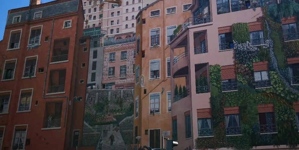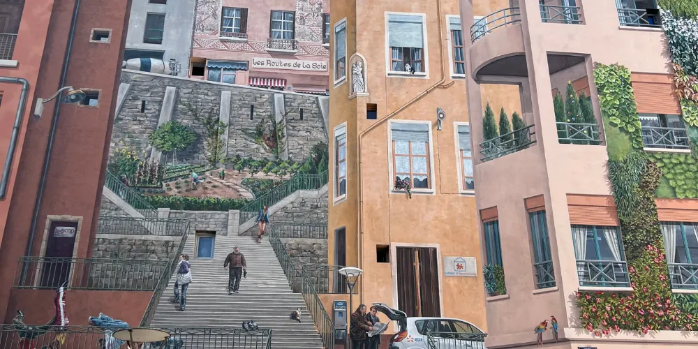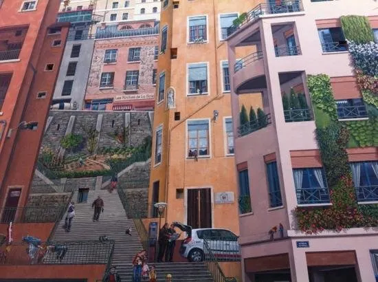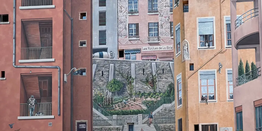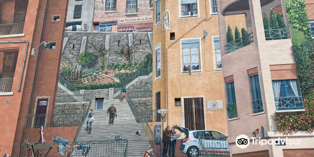 絲織工人之牆的名字可直譯為《卡尼》,總面積達到了1200平方米,據說是目前歐洲最大的城市壁畫,生動再現了裡昂街區絲織工人日常生活的場景。巨大的壁畫繪滿了樓房的整個牆面,牆體上的窗戶巧妙地融入畫中,成為街景樓房中的一部分。完美的3D效果幾乎以假亂真,似乎你面對的不是一面牆而真的可以走入畫中,在兩排樓房之間的上坡小路拾級而上。