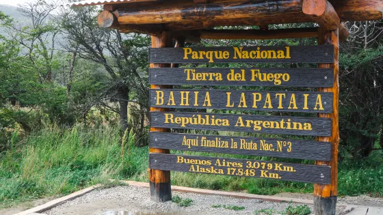 乘坐小火車進入國家公園後,下火車再換大巴,沿著3號公路向西行駛,半小時後到達3號公路的終端,這也就是泛美公路的最南端。泛美公路是貫穿整個美洲大陸的公路系統,它北起阿拉斯加,南至火地島,全長47515公裡,把北美洲和南美洲連接起來,3號公路是泛美公路在阿根廷境內的延伸段。路邊一塊大木牌上標示著,此處距布宜諾斯艾利斯市3079公裡,距阿拉斯加17848公裡。