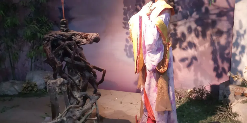 古越台依山而築,正對門樓。台內奉越王勾踐,兩側立謀巨范蠡、文種,臺中上懸“卧薪嚐膽”匾額,盡顯勵精圖治、滅吳雪恥之志。造像高大魁梧,系樟木雕刻。