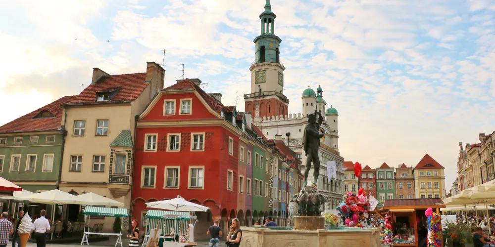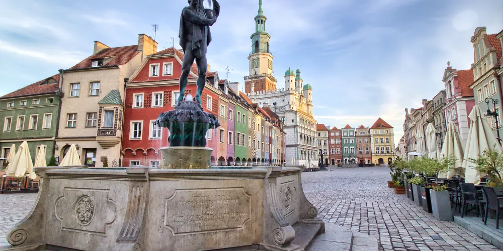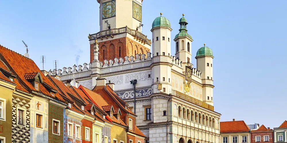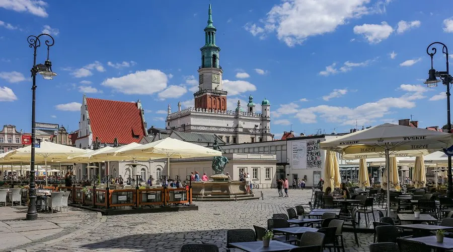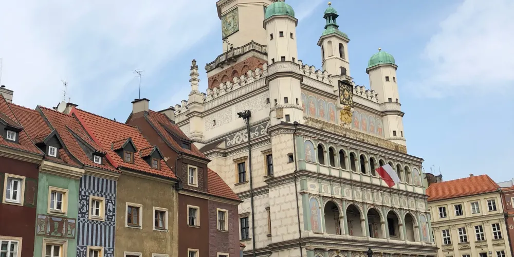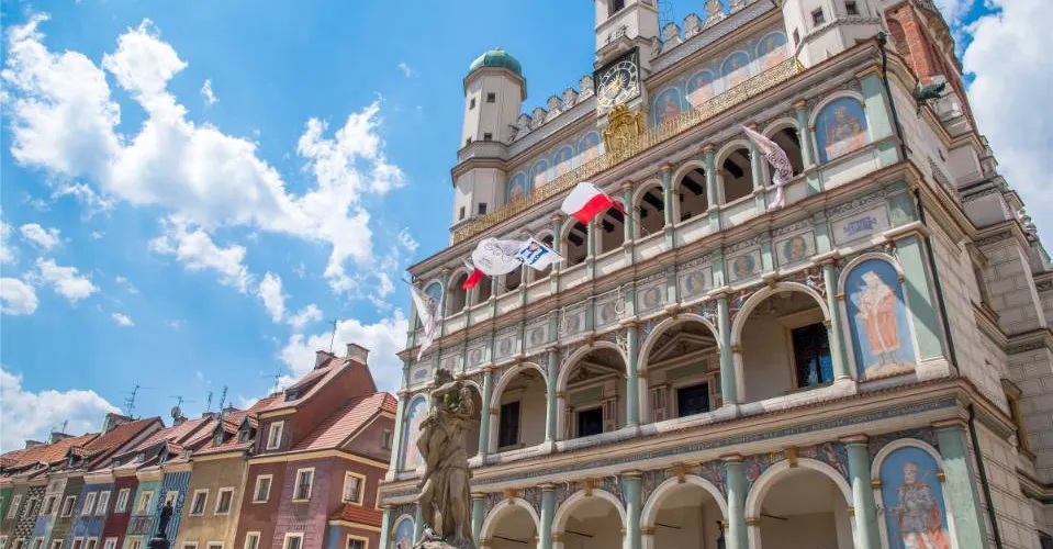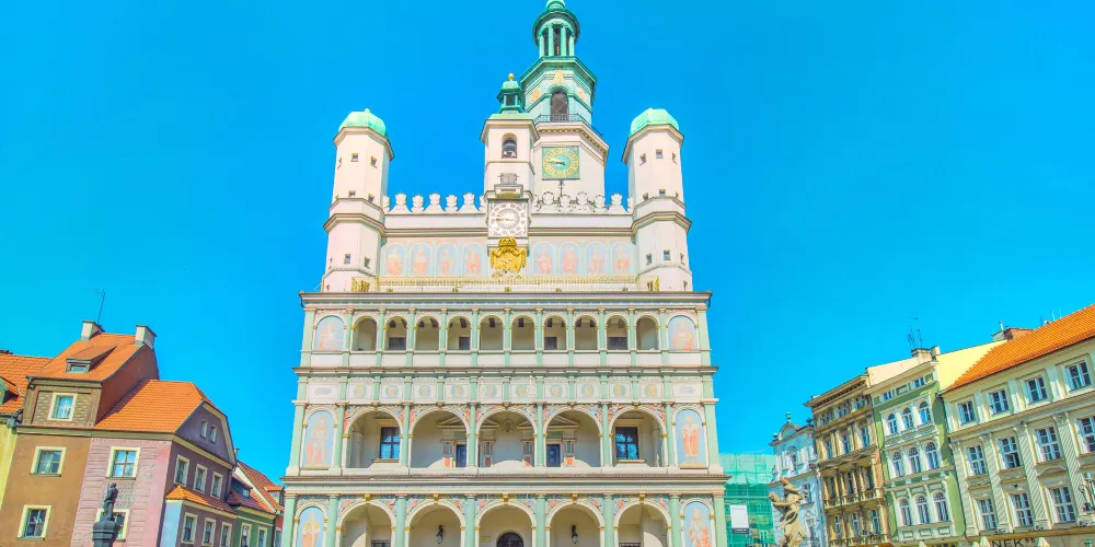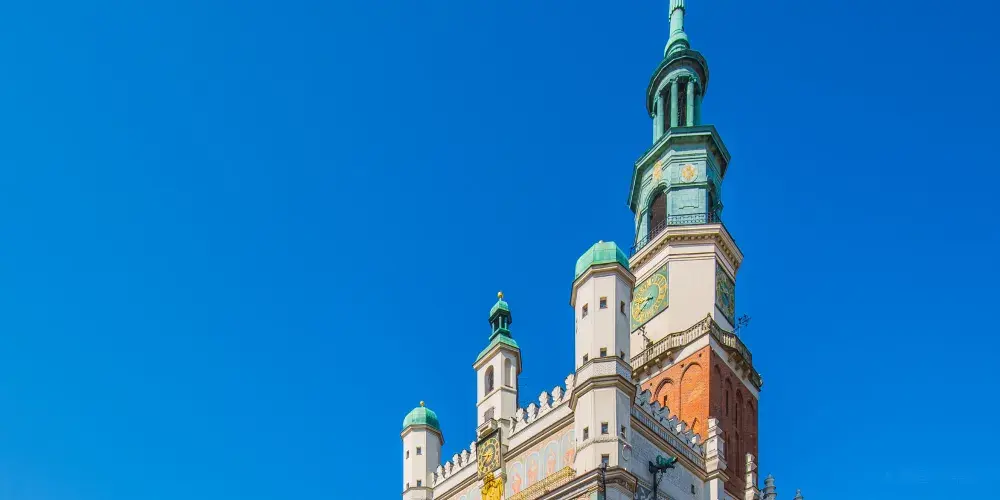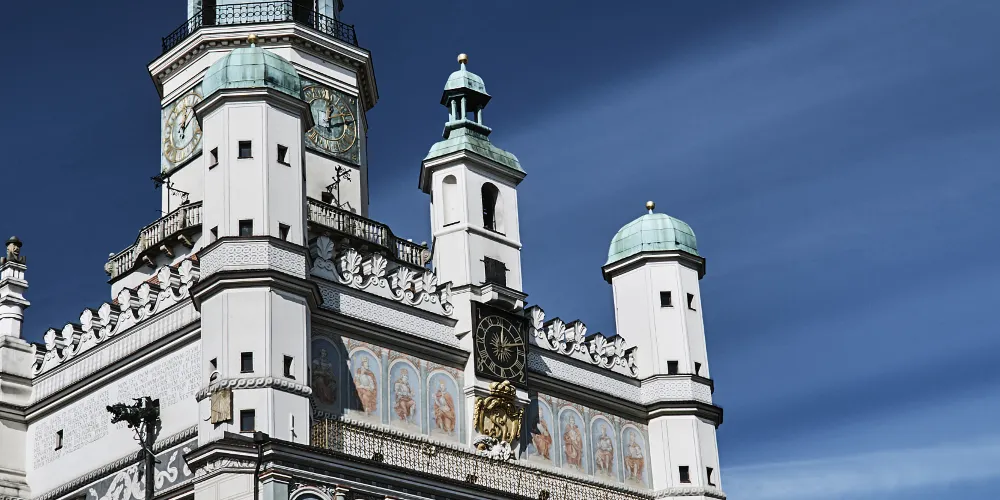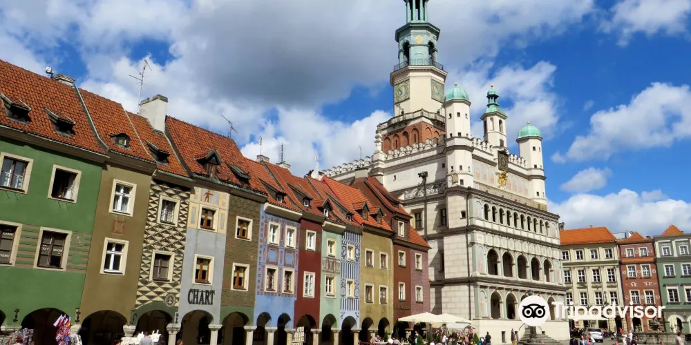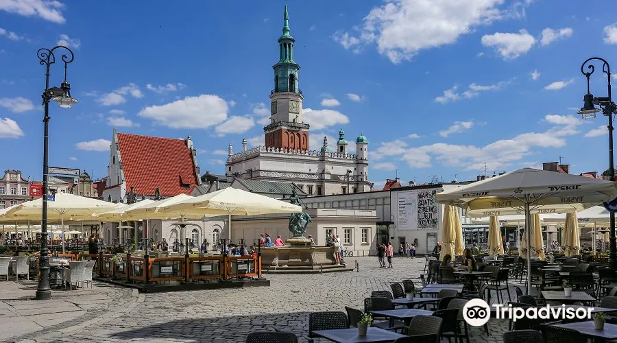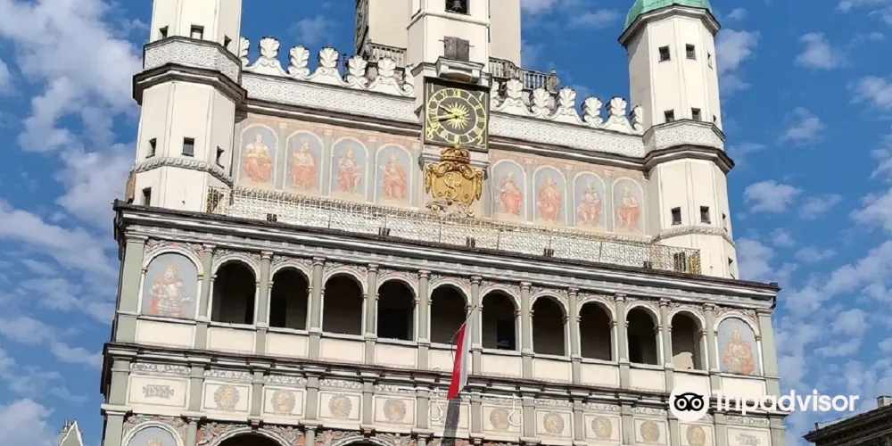 立面三層拱形窗,立面頂三座小穹頂,正堂一座大穹頂,這就是波茲南的市政廳。目前地下室仍然保留十三世紀的原始結構。這裡的曆史博物館展示了波茲南自公元11世紀至1945年的曆史。