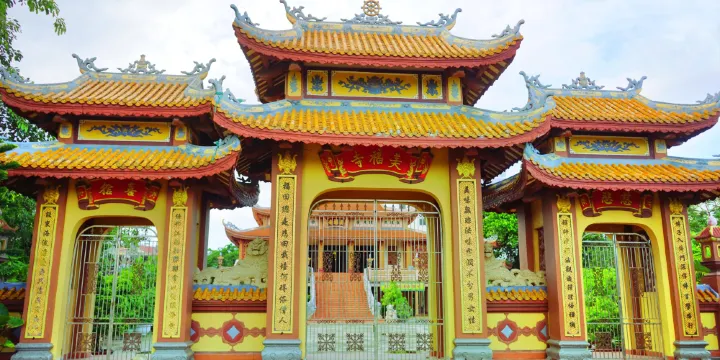 在峴港海邊的一個寺廟,外觀以土黃色為主色調,建築風格完全屬於中國佛教格調。寺廟裡面有尼姑住持,寺廟旁邊是曆史遺迹美溪亭所。如果正好路過這兒,可以遊覽一番。