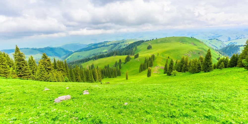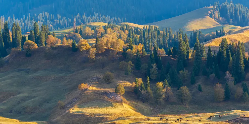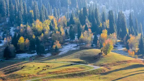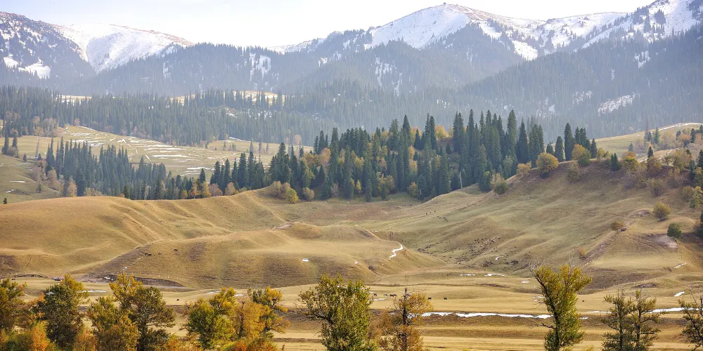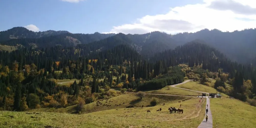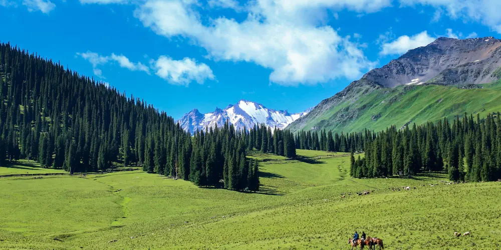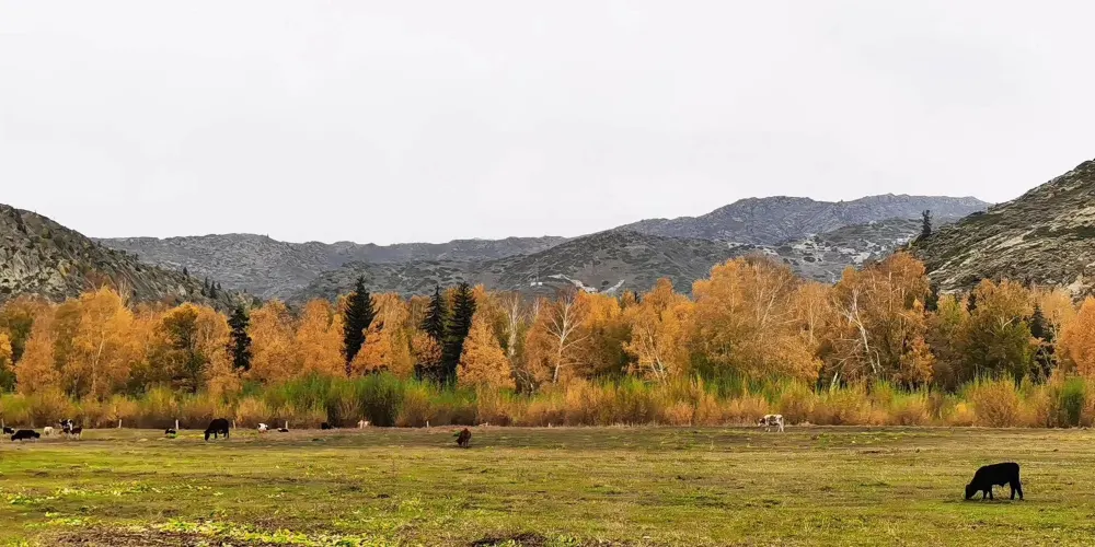 這裏地勢平坦,水草豐美,擁有優美的自然風光。夏季,草原綠意盎然,野花遍地,藍天白雲下牛羊成羣,風景如畫;秋季,金黃的草原與遠處的雪山相映成趣,構成了一幅美輪美奐的秋日畫卷。它不僅是一個觀光勝地,更是一個能讓人心靈得到放鬆和凈化的地方。遊客可以在這裏感受大自然的壯麗與寧靜,體驗哈薩克人民的熱情與好客。