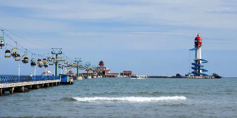 南戴河位於秦皇島市撫寧區,與避暑勝地北戴河隔河相望,一橋相連。南戴河水溫適度,海灘沙細柔軟,海水清澈透明,水底無礁石碎塊,是進行海浴、日光浴的理想天然場所。來南戴河的遊客可以賞美景,品嚐海鮮,盡享水上游樂項目。