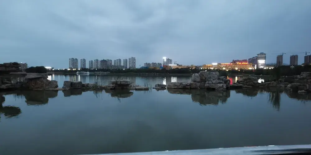 韓城市區復興路,非常漂亮。沿湖景色秀麗,晚19:30和20:20有燈光秀表演,很驚艷。是利用水幕進行投影,介紹韓城歷史及城市特色。
