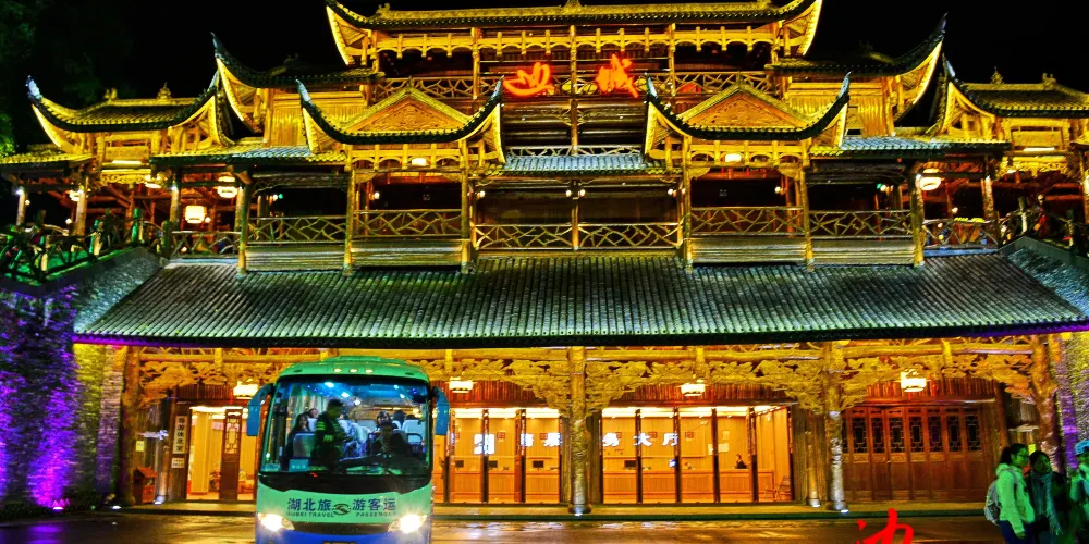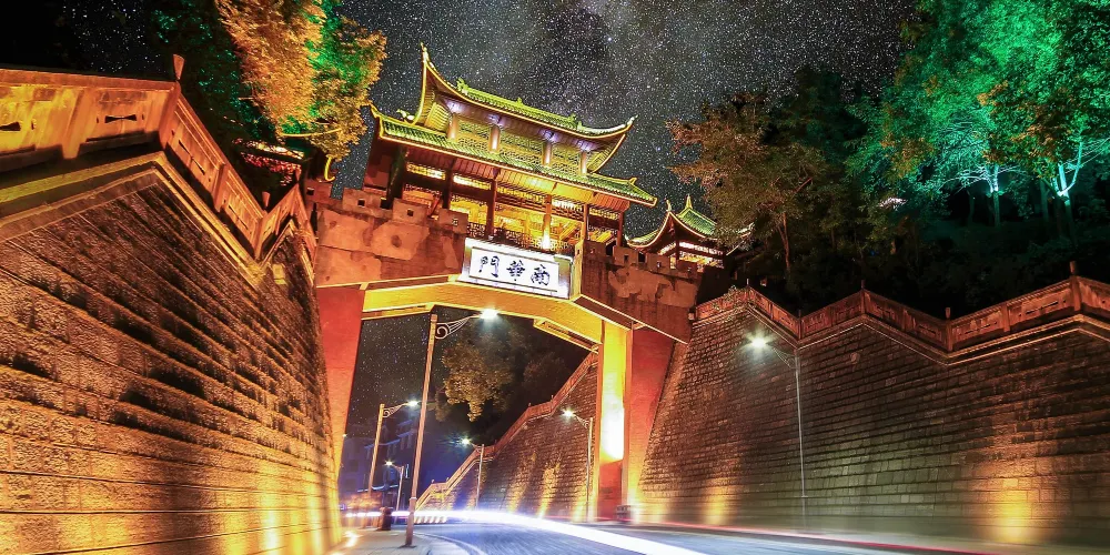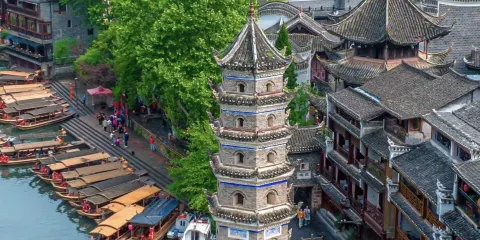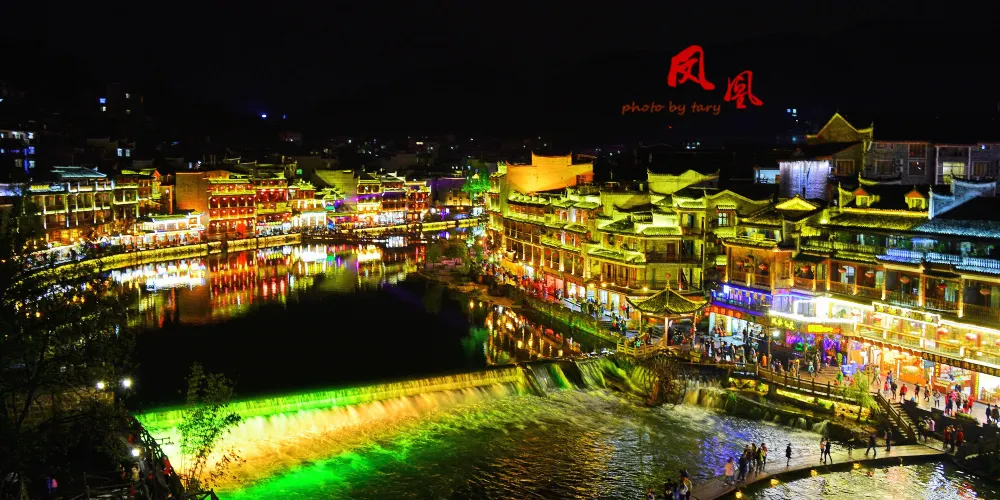 沱江跳巖,是鳳凰城古城的標誌性景點之一,位於古城北門外的沱江上,全長約100米,共15個岩墩。沱江跳巖始建於清康熙四十三年(1704年),當年這裡是東北向進出鳳凰古城的主要通道之一。因為人們經過時必須踩著這一路岩石,一跳一跳地過河去,「跳岩」便因此而得名。