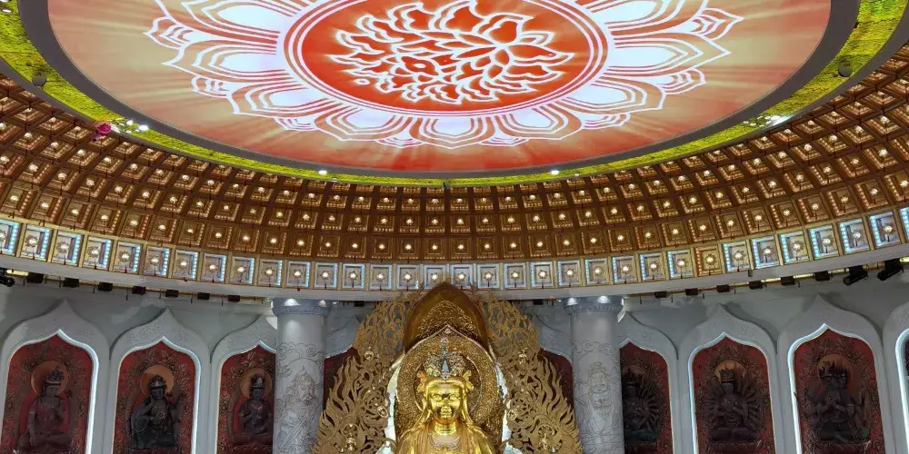高108米的觀音菩薩聖像矗立於南海碧波之上,這座聖像不僅是南山文化旅遊區的地標,更是眾多佛教信徒的朝拜聖地。觀音像巍峨壯觀,一體化三尊,分別持珠、持篋、持蓮,寓意慈悲、智慧與和平。遊覽時除遠觀近賞外,還可乘搭電梯或步行登上觀音像的蓮花底座,觸摸佛腳,誠心祈福。