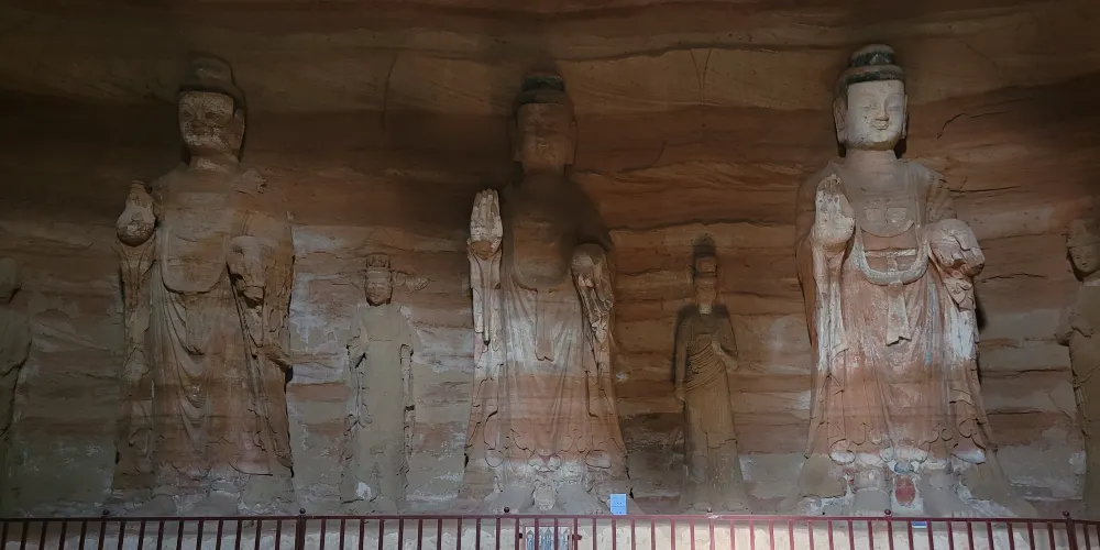 南石窟寺與甘肅慶陽北石窟寺系同一時期開鑿,均為北魏涇州剌史所造,被譽為“南北石窟雙明珠”。南石窟寺現存石龕5個,衹有一、四窟有造像。一號窟是主窟,窟門兩旁開有方龕於壁巖之上。窟高13米,長17米,寬24米,呈長方形。窟頂為復鬥型,結構獨特,造型宏偉,門上設明窗。入窟門,迎面三壁圍站着高6米的七尊佛像。這種七佛一堂排列格式,在國內大石窟中均未有見。七佛頭、手大於正常比例,體型較肥矮,樸實健壯,呈北方民族氣魄。佛像高鼻大耳,面部豐滿,表情慈祥,形態淳厚,神情肅穆,居高臨下,俯覽眾生。七佛間雕有脅侍菩薩十三尊,儀態秀曼,婷婷玉立。窟頂還雕有傳教故事,描繪釋迦牟尼自誕生至出家的情節,造型生動,頗有生活情趣,是一件藝術珍品。四號窟為唐代開鑿,洞窟為5平方米,呈方形,泥塑造像,正中供文殊菩薩、普賢菩薩和觀音菩薩,兩側壁畫有六力士、八大菩薩形象。南石窟代表着中國佛教石窟別具一格的藝術形式。