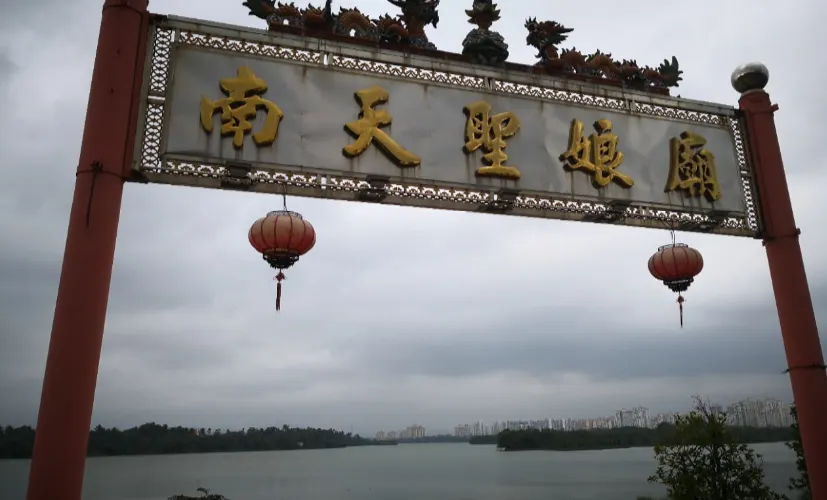 南天聖娘廟是一座媽祖廟宇,沿襲海南媽祖廟的一慣風格,紅磚的外牆,金色的屋檐高高翹起。建在萬泉河邊想必是為了保佑出海的漁民。儘管廟宇不是很大,但廟內香火持續不斷,表明海南人民對女性和母系還是心存敬仰的,尤其海南的海神媽祖娘娘。