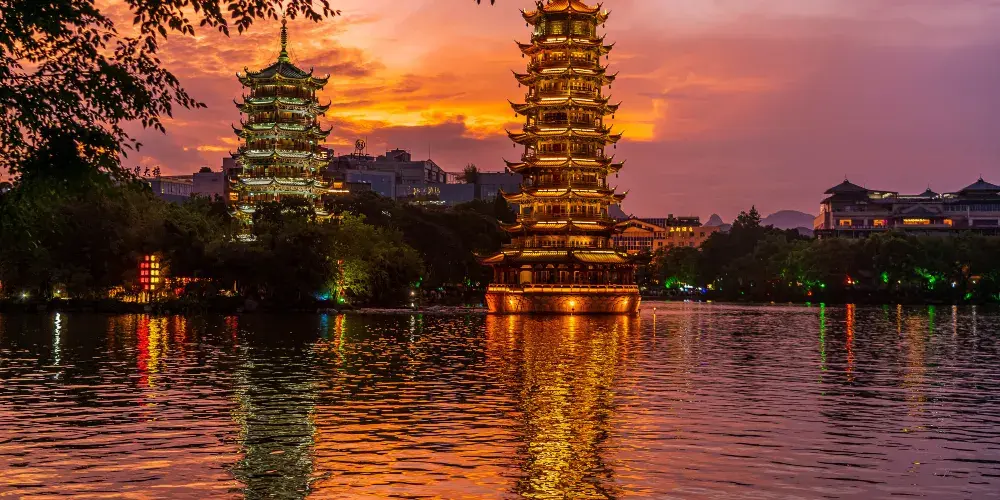 日月雙塔是桂林的地標建築,日塔為銅塔,月塔為琉璃塔,兩塔之間以湖底一條10多米長的湖底隧道相連。雙塔的四周、內牆、門窗等處都充滿了五彩繽紛的圖案。每到夜晚,兩座塔在燈光映襯下分別散發著金銀兩色光芒。可以在杉湖沿岸觀看雙塔的美景。