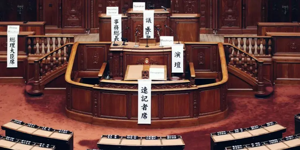 國會議事堂整座樓是一座近代式樣的白色宏大建築,左右對稱,左側為眾議院,右側為參議院,各高三層。在國會議事堂的正門內,立有伊藤博文、大隈重信、板垣退助的銅像。議事堂的周圍有首相官邸、議員會館、記者會館和國會圖書館等。