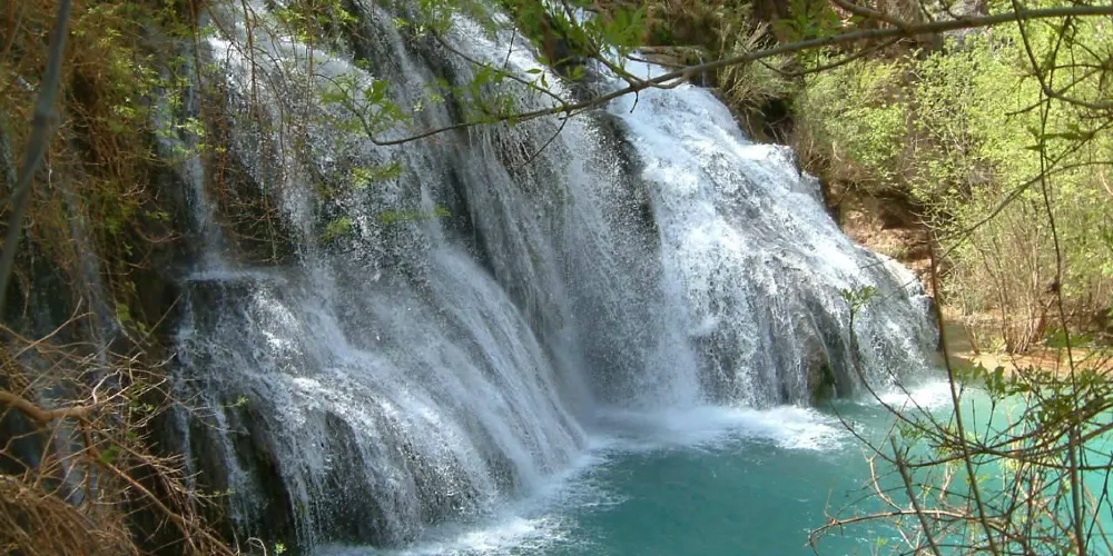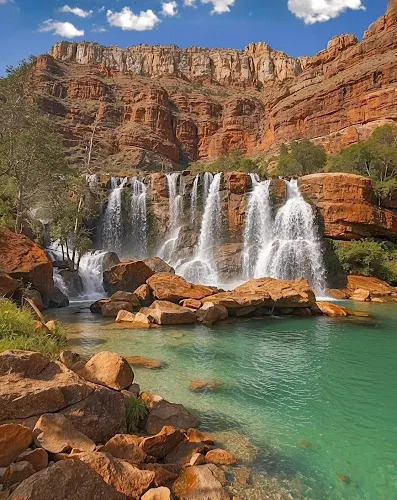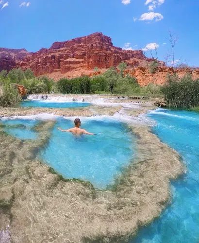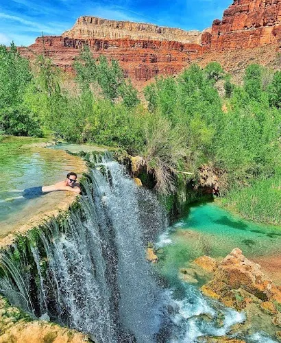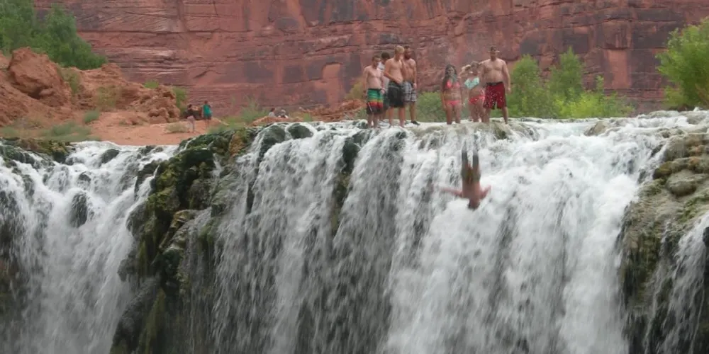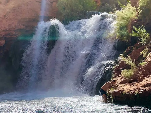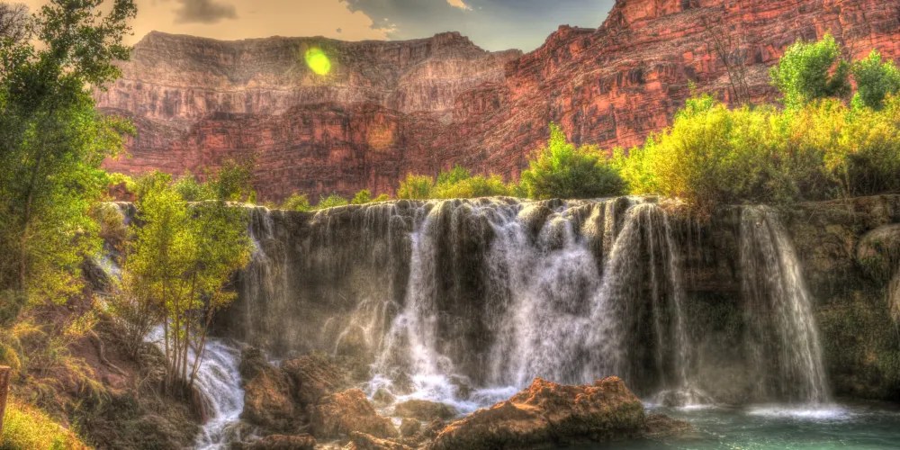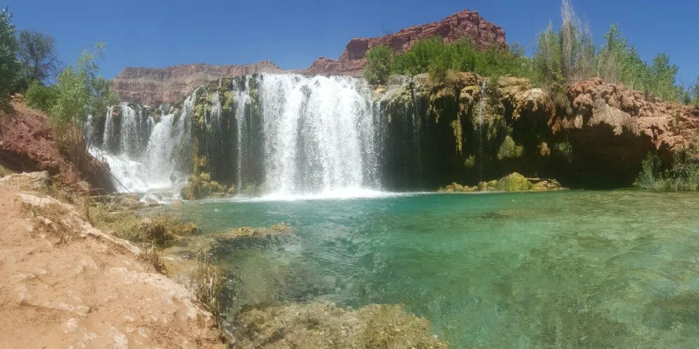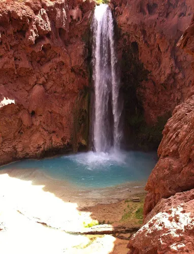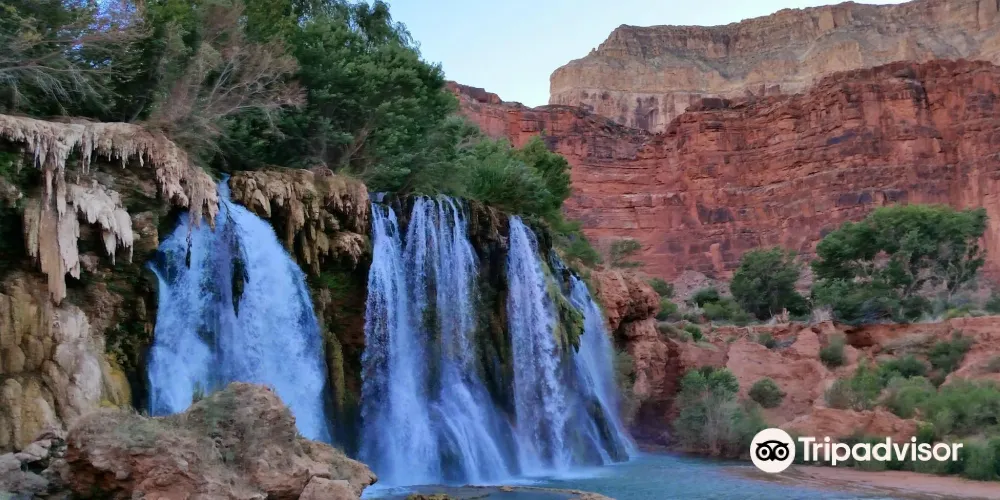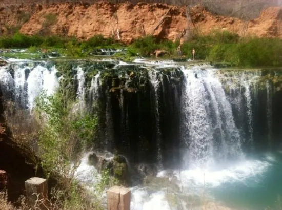 哈瓦蘇瀑布被稱為北美一大瀑布,雖然它30米的落差並非很高,但瀑布以其顏色的絢麗和變化多端而著稱。你會看到瀑布水流呈現藍色,是因為其中含有石灰華物質。藍色的瀑布沿着紅色的巖石傾瀉而下,直落到綠寶石一般的湖中,令人眼花繚亂。瀑布腳下有一塊長滿草的小土丘,從這裏可以仰望哈瓦蘇瀑布,也是別有一番趣味。