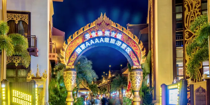 傣族古鎮位於雲南德宏傣族景頗族自治州芒市,以國家4A級景區標準建設,通過深入挖掘傣族歷史文化,以古傣文化為統領,以建築為骨、以商貿為氣、以非遺為技,依託山形水勢,打造一座集文化體驗、休閒度假、旅遊服務和生態居住為一體的世界古傣文化體驗地。主街兩側分佈著改良後的傣式吊腳樓,灰瓦木簷與雕花窗欞保留民族特色。傣族古鎮「月月有主題節慶、日日有常態活動、每年有大型慶典活動」,已開展多場主題、文藝等活動,也讓很多遊客在這裡感受到了芒市的獨特魅力。