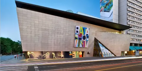 美術館門前有一座青銅雕塑作品,這是著名的英國雕塑家亨利·摩爾創作的。而在正門北側的水泥建築上多了一面炫目的玻璃牆和一個輕薄的玻璃翅膀,夜晚燈光的照射讓玻璃建築通體發光,成為夜幕下一道亮麗的風景線。