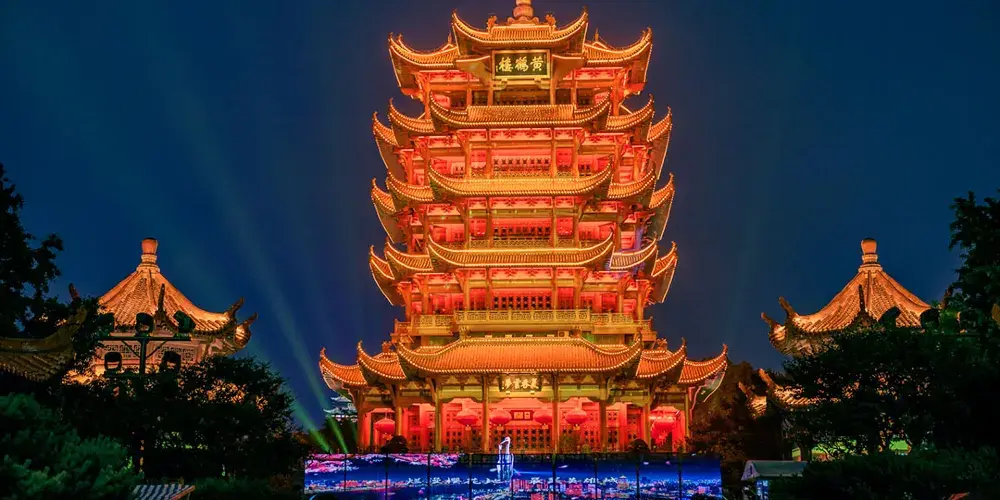 《夜上黃鶴樓》由武漢市園林局、武漢旅遊體育集團聯合黃鶴樓公園共同打造,是集實景化、行浸式、體驗型於一體的文化旅遊演藝,也是黃鶴樓1985年重建落成以來開放夜間遊覽。項目以黃鶴樓公園為載體,圍繞其獨特的歷史文化,採用聲光電結合的手法,融入藝術表演與遊園模式,透過高科技光影技術打造的城市地標夜遊新體驗。