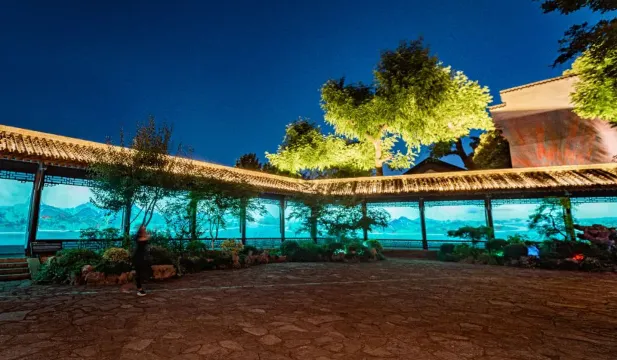 詩碑廊上淡雅的山水圖景,循環點亮不停歇。值得一提的是,最近長廊兩頭各多了一個QR code,遊客掃碼後可以在畫捲上發送實時彈幕,趕緊來體驗吧!