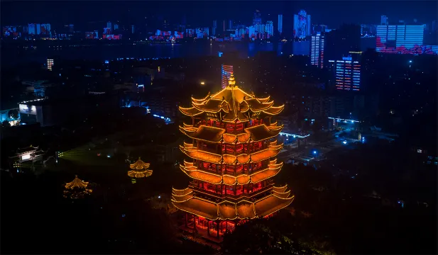 龜蛇鎖大江,黃鶴樓屹立於蛇山之巔,登上主樓俯瞰,萬里長江穿城而過,大江奔流的磅礴氣勢、城市夜景的絢爛璀璨,盡收眼底。